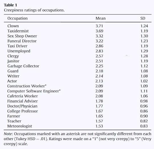 This situation was rectified by Professor Francis T. McAndrew and Sara S. Koehnke of the Department of Psychology, Knox College, Galesburg, US, in a 2016 paper for the journal New Ideas in Psychology. The team stopped short of giving an exact definition of ‘creepiness’ – nevertheless, they were able to generate a list of the perceived ‘creepiness’ ratings for various professions :