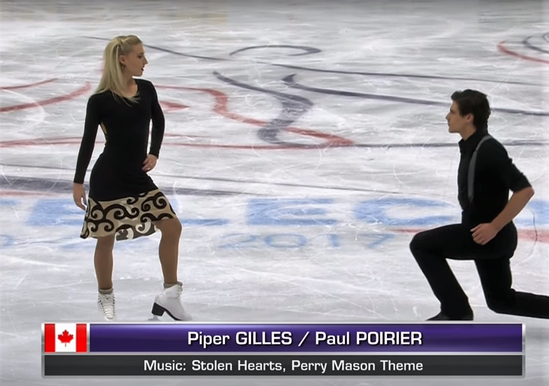 Free Dance to Stolen Hearts, Perry Mason Theme by Fred Steiner, Smokey Sax Perry, Mason Theme by Fred Steiner: I'l be really honest: I am usually a BIG FAN of Gilles and Poirier when it comes to their costumes through all these years, however...these are TERRIBLE! I'll (kind of) excuse his black shirt/black pants and suspenders look (I guess he's supposed to be Perry Mason or maybe a private investigator?) but Piper's dress leaves me perplexed. I am so surprised this dress made it to the ice. It fits odd (no swing to her skirt and it needs more flare), the oversized scroll pattern is jarring and it just does nothing to the pair or the dance. It was so distracting, I could not concentrate on their great skating. I can think of a million more creative ways to incorporate that scroll like pattern into her costume. I love this pair and hope somebody rescues them from these costumes. Please change this ASAP!
