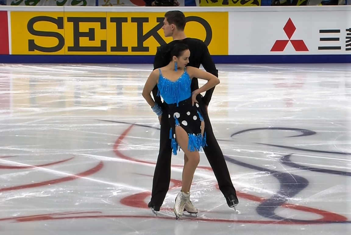 Betina Popova and Sergey Mozgov of Russia: Russians Popova and Mozgov skated their Short Dance to Cha Cha; Rhumba: Formidable by Stromae and Samba: Batacuda Mixes performed by D.J. Dero. The costumes were fun, kooky and right for the Cha-cha/Rhumba/Samba music. Her costume utilized the beaded fringe to add flutter and cha-cha movement to their dance and the polka dots--while being a little distracting--were bold enough to compete with the music and dance. I especially liked his top, especially the subtle baby blue colored piping that referenced to her kooky-and-crazy look.