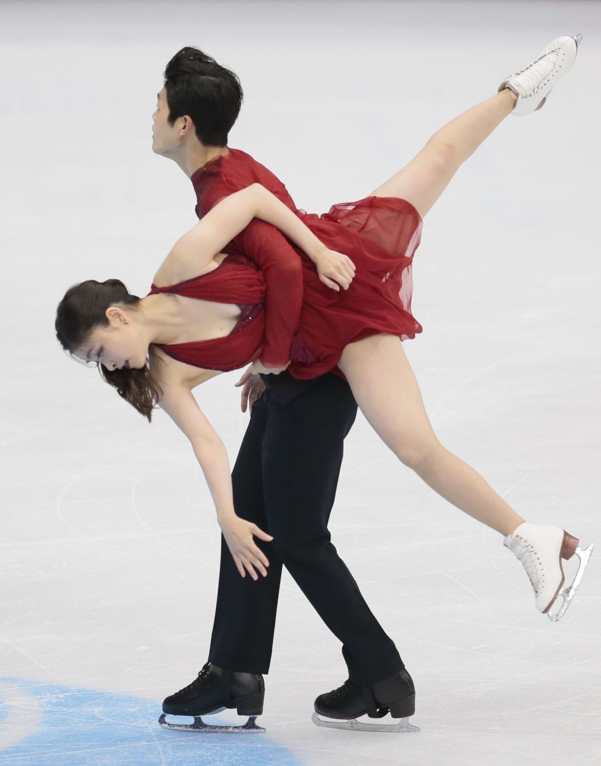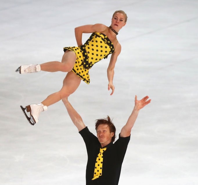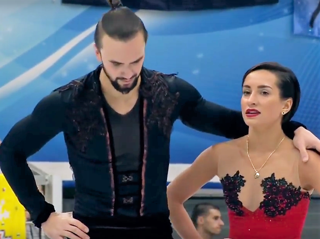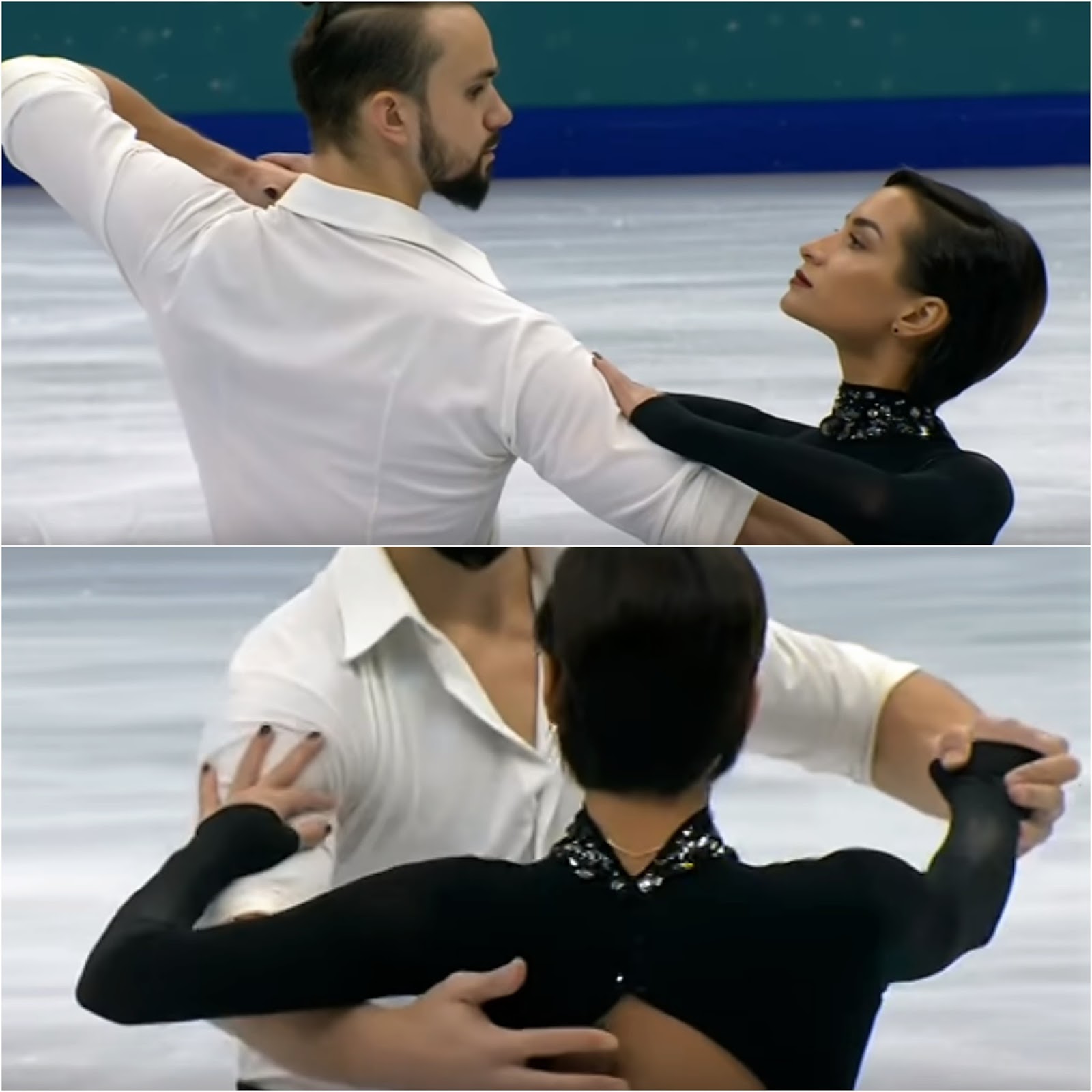 Ksenia Stolbova and Fedor Klimov of Russia: For their Short Program to Tango de Besame performed by Benise, the Russian pairs of Stolbova and Klimov, went with dramatic and sleek black-and-white looks. Fedor wore a white dress shirt and super tight black pants and Ksenia donned a black mini dress with an open back and bejeweled high neckline. They looked like Tango Experts showing a lesson in Buenos Aires which I guess was the point.