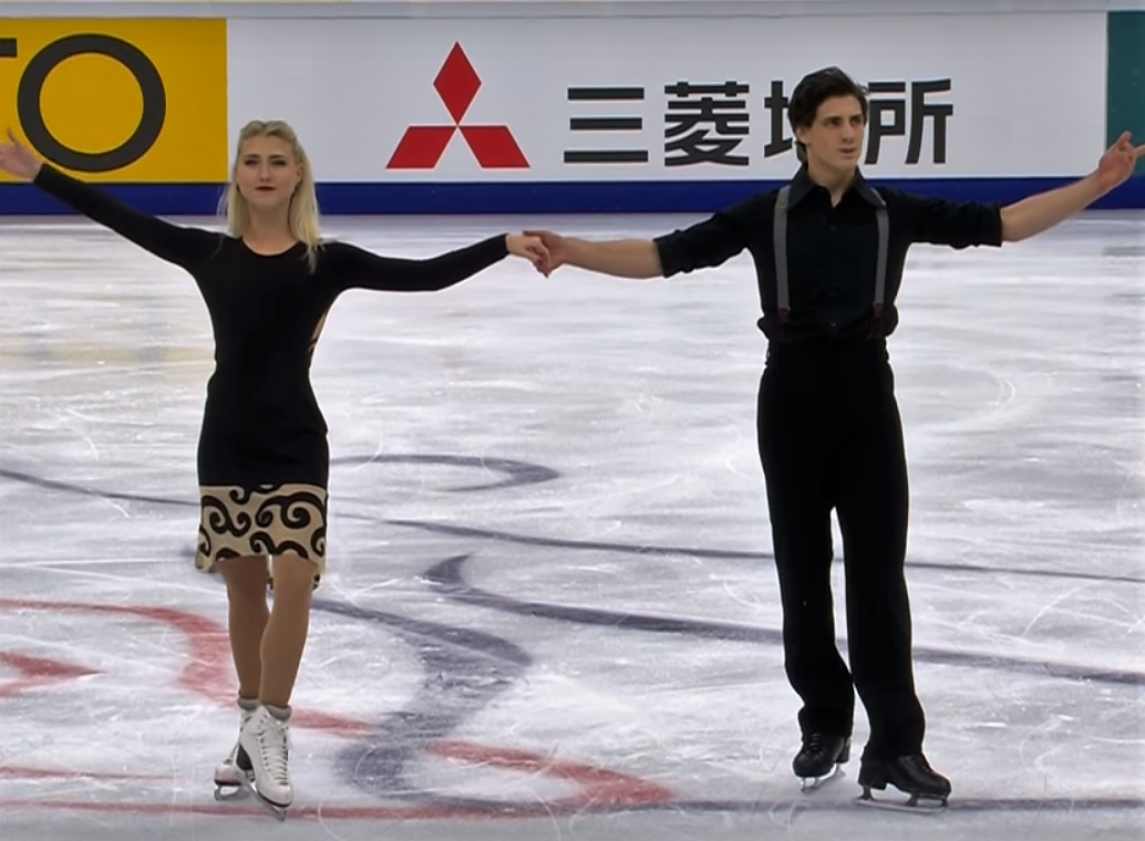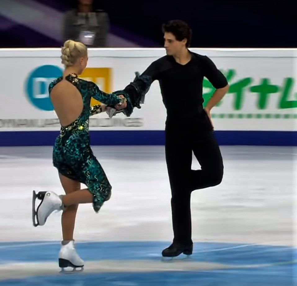 Free Dance to Stolen Hearts, Perry Mason Theme by Fred Steiner, Smokey Sax Perry, Mason Theme by Fred Steiner: I'l be really honest: I am usually a BIG FAN of Gilles and Poirier when it comes to their costumes through all these years, however...these are TERRIBLE! I'll (kind of) excuse his black shirt/black pants and suspenders look (I guess he's supposed to be Perry Mason or maybe a private investigator?) but Piper's dress leaves me perplexed. I am so surprised this dress made it to the ice. It fits odd (no swing to her skirt and it needs more flare), the oversized scroll pattern is jarring and it just does nothing to the pair or the dance. It was so distracting, I could not concentrate on their great skating. I can think of a million more creative ways to incorporate that scroll like pattern into her costume. I love this pair and hope somebody rescues them from these costumes. Please change this ASAP!