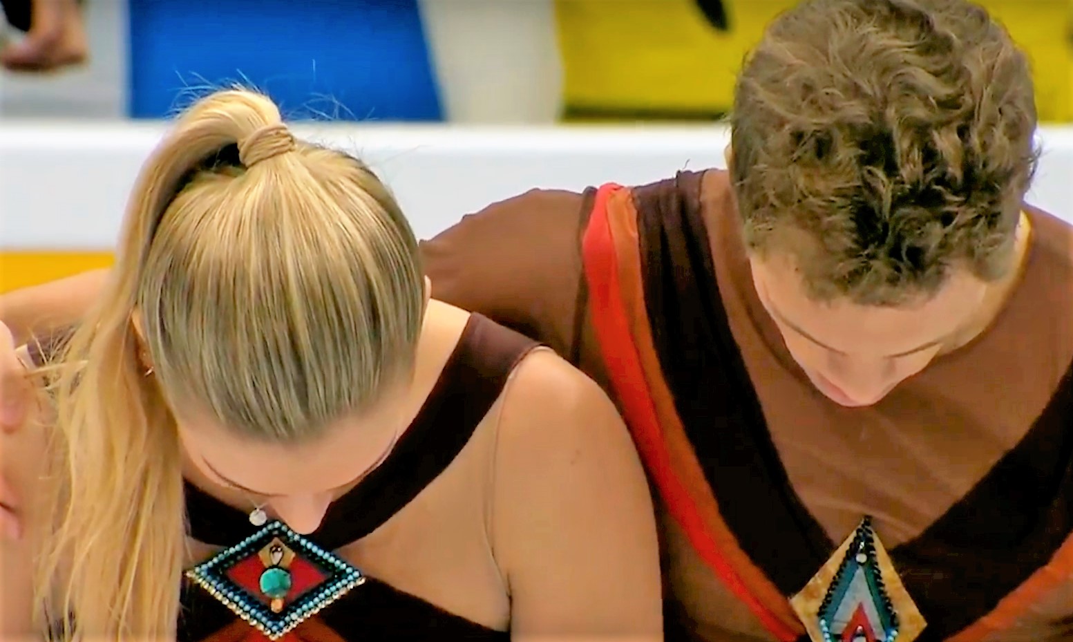 Free Dance to Ghost Dances: La Partida by Victor Jara; Sikuriadas by Inti Illimani and Quiaquenpita by Inti Illimani. This was an odd dance and odd music choice. The music was neo-folkloric from Chilean artist Victor Jara Latin American folk music style from Inti Illimani. It was just unusual since one doesn't normally hear this type of music in Ice Dance. I love this music but maybe not in this kind of stage. The costumes reflected a "South American Indigenous Tribe" look to them but to see them on two VERY WHITE kids from the US, well...it just seemed almost too "Halloween Costume"-like.