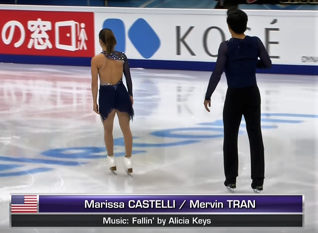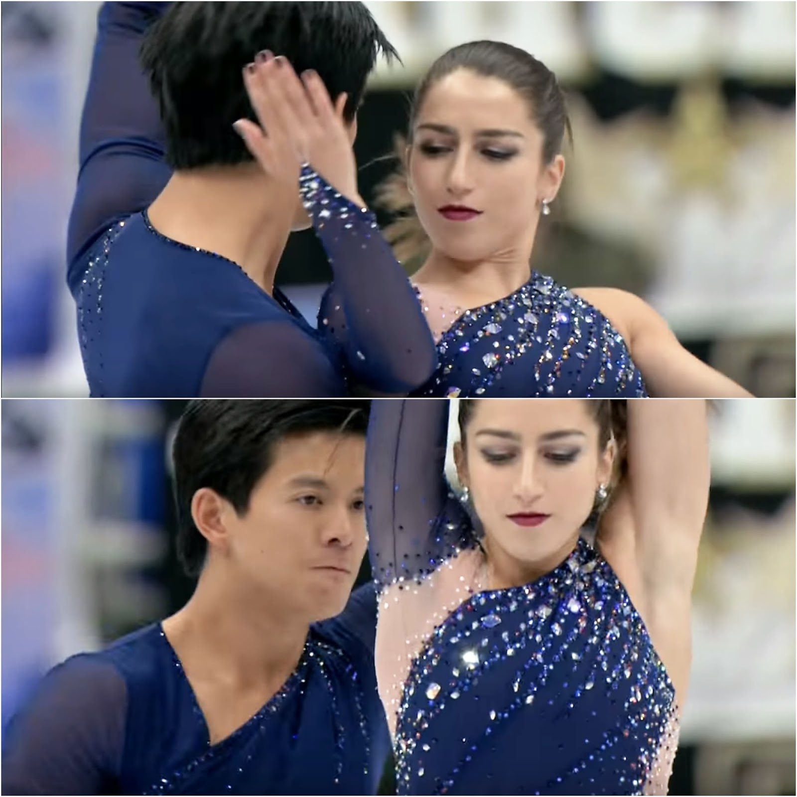 Marissa Castelli and Mervin Tran of USA: Americans Castelli and Tran wore these costumes to their Fallin' by Alicia Keys Short Program. If these seem familiar, it is because they are: They are the same costumes from last season (same program music as well). It seems that this is the season of programd and COSTUMES REDUX with several skaters like Yauzuru Hanyu, Mirai Nagasu and now Castelli and Tran...wearing the same costumes they have worn before (are they under budget constraints??). Anyhow...I thought these were one of THE BEST of last season and they still hold up now. Gorgeous styling, expensive beading...LOVE her one shoulder-like design and especially how draped and beautiful Mervin's costume is. So happy when a costume designer thinks about the guy as well (and the guy allows themselves to NOT be given a BLACK SHIRT and BLACK PANTS from Nordstrom Rack!).