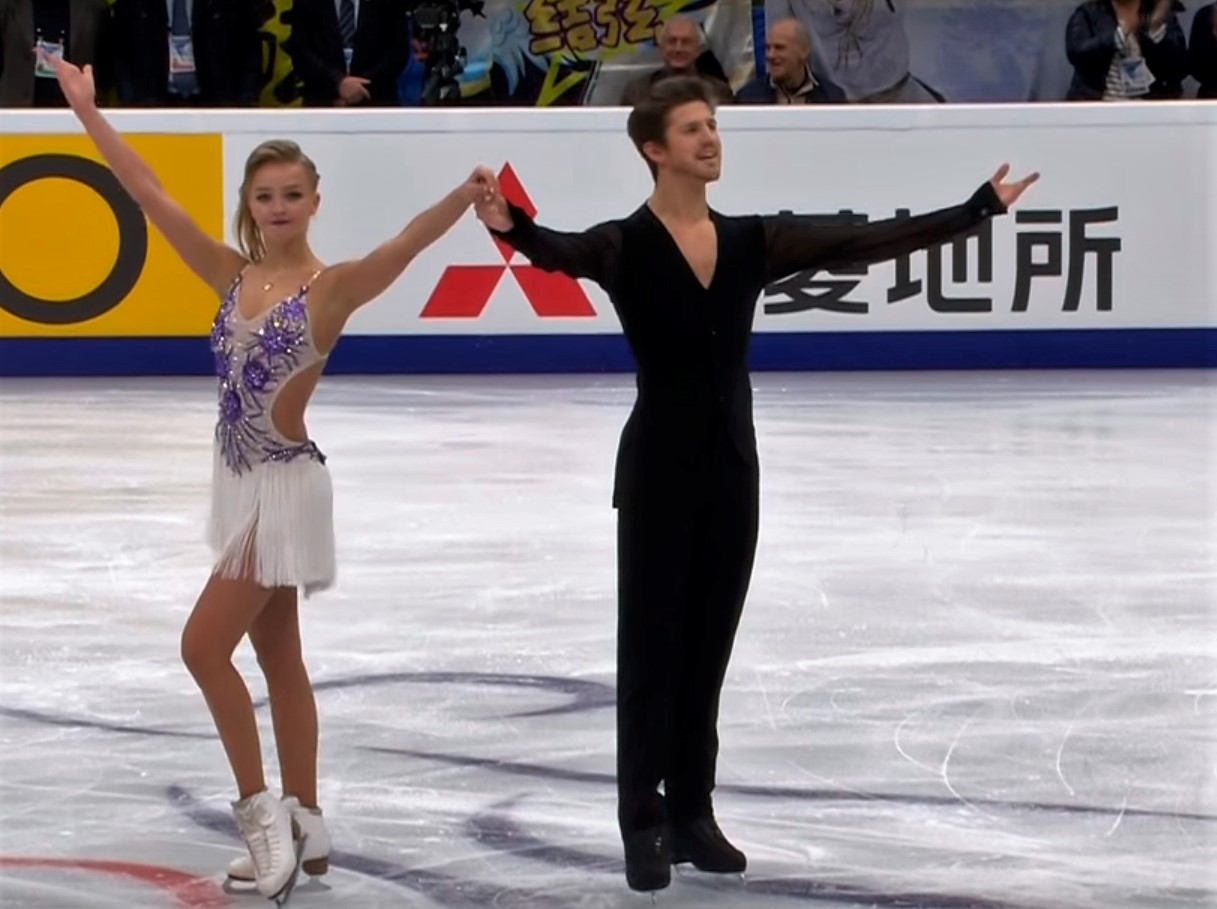 Alexandra Stepanova and Ivan Bukin of Russia: Russia's model-looking Ice Dance couple of Stepanova and Bukin skated their Short Dance to Rhumba: Espérame en el Cielo by Mayte Martin, Samba: L'Ombelico Del Mondo by Jovanotti, Rhumba: Chandelier (Dj Maksy Rumba Remix) by Sia and Samba: Samba Do Brasil by Bellini. Once again, she followed the costume lead of her Ice Dance compatriot of Ekaterina Bobrova and went super sexy! She wore a completely open back dress in nude with purple sequined appliques. Oh, and a fringe skirt that would make Bob Mackie blush! If anyone is going to get away with this look, it's Miranda Kerr-lookalike Alexandra Stepanova. Her partner wore (wait for it!)...an all black outfit. At least it had a plunging neckline and an asymmetrical hem on his shirt. At least.