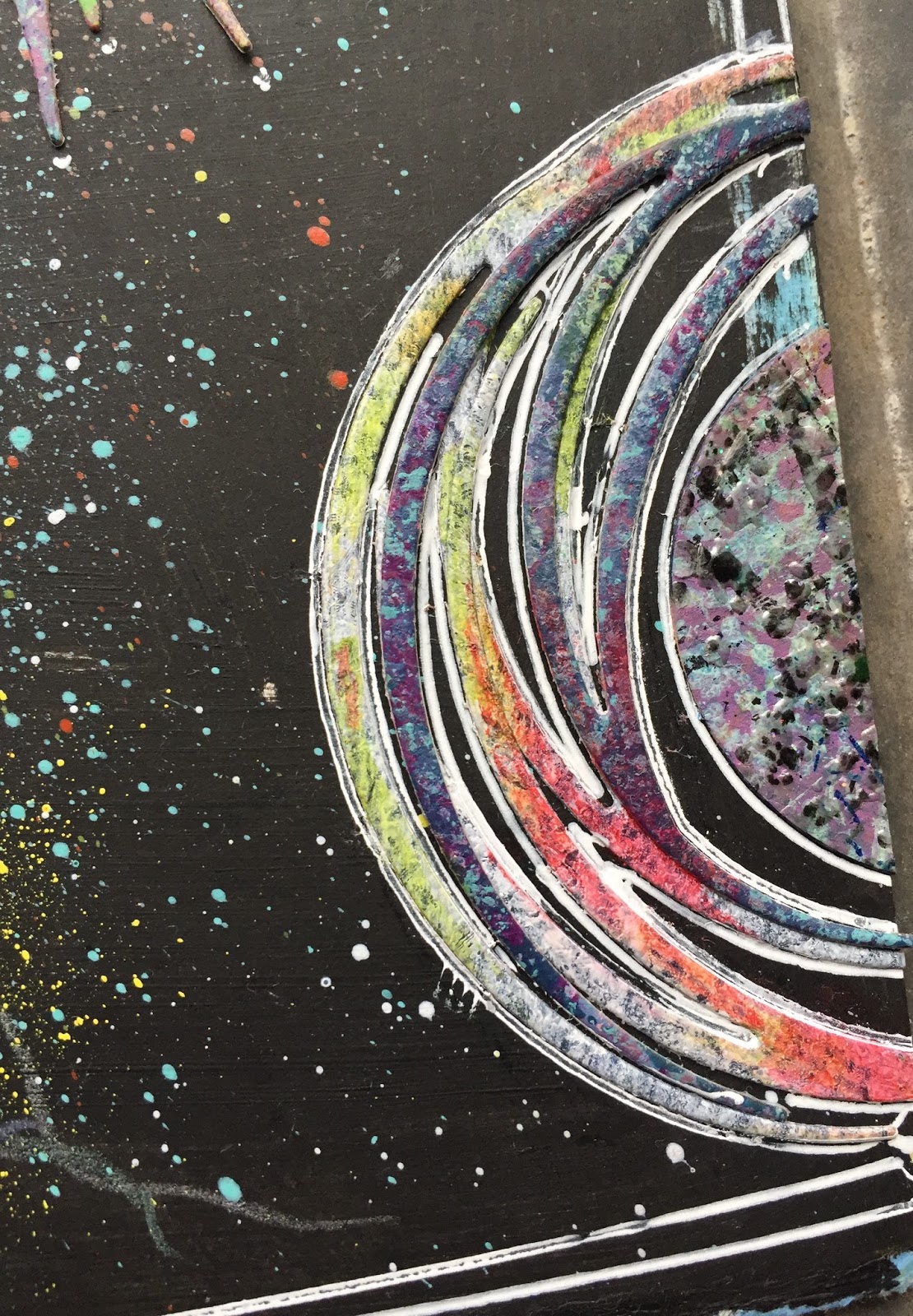 I start by choosing or creating a background. For Starburst I painted black gesso on an 8.25 inch square of watercolor paper which I splattered with paint from multiple colors of paint pens. I was going for the look of a night sky. I then chose three dies, all from my newly released collection, to represent planets and stars. First up, Strands.