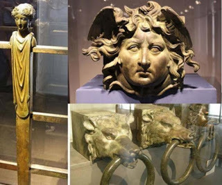 Some of the decorations from Caligula’s Nemi ships: A bronze railing ( CC BY SA 2.0 ), a face (Miguel Hermoso Cuesta/ CC BY SA 3.0 ), and brass rings recovered in 1895. These were fitted to the ends of cantilevered beams that supported each rowing position on the seconda nave. ( CC BY SA 3.0)