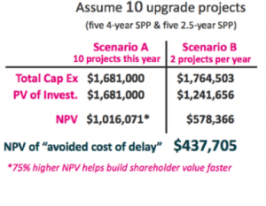 Keep in mind what this means. You can get a 75% higher net present value if you did all 10 projects this year as opposed to phasing them in over a five-year period.