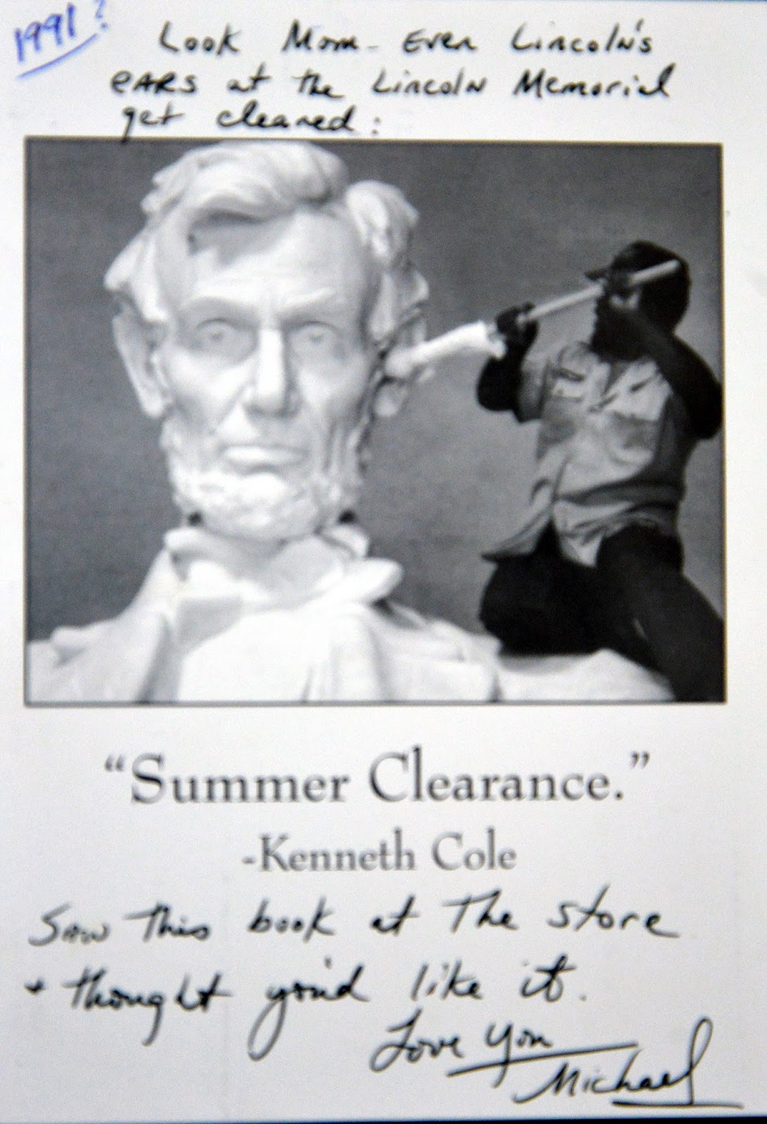 And a third “SUMMER CLEARANCE” postcard of Abe Lincoln that I picked up at the Palm Springs Cabazon outlet in the Kenneth Cole story some time ago was the last card I sent to mom (along with a book I thought she’d like to read):Look Mom,…even Lincoln’s ears at the Lincoln Memorial get cleaned. I saw this book at the store and thought you’d like it.Love You, Michael