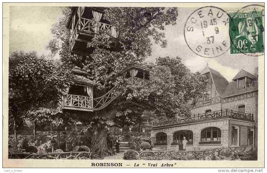 He created a restaurant perched in an old Chestnut tree he called the Grand Robinson. It was an instant success and competing taverns and restaurants multiplied quickly, adopting the same Crusoe theme along the Rue Malabry. In 1888, “Le Grand Robinson”, not to be confused with “the Grand Arbre”, which set up shop just opposite, had to change its name to “Le Vrai Arbre de Robinson” (the Real Tree Robinson”), in order to set itself apart from the competition.