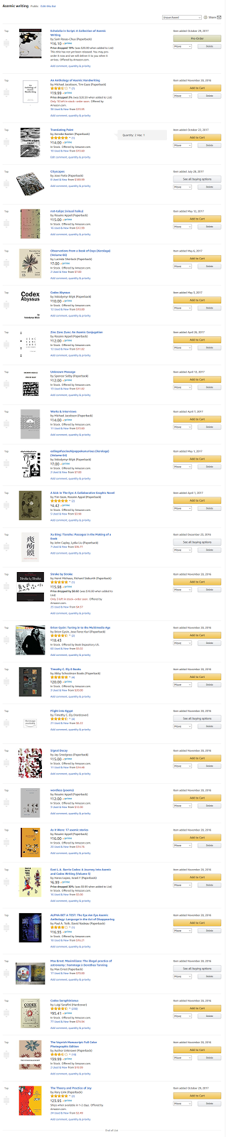 The Amazon asemic writing list includes all Post-Asemic Press titles along with other titles from other publishers.