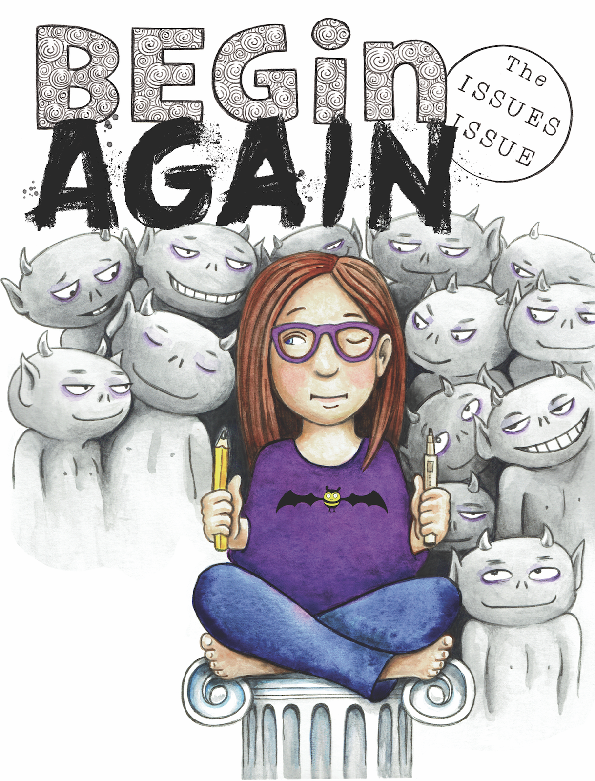I decided to feature them in the second issue of BEGIN AGAIN, "The Issues Issue" (ha ha!). I think it took longer to design the cover than it took to create the mini-comic! But it felt really good to "flesh" them out in watercolor and gouache.
