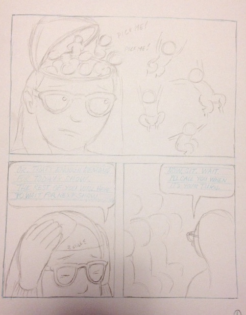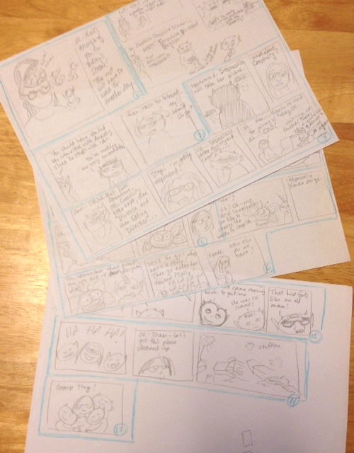 On Wednesday, I blew up the thumbnail sketches and started refining, adding details and text. This is the same page shown above (page 10) but in full-size pencil sketch form...
