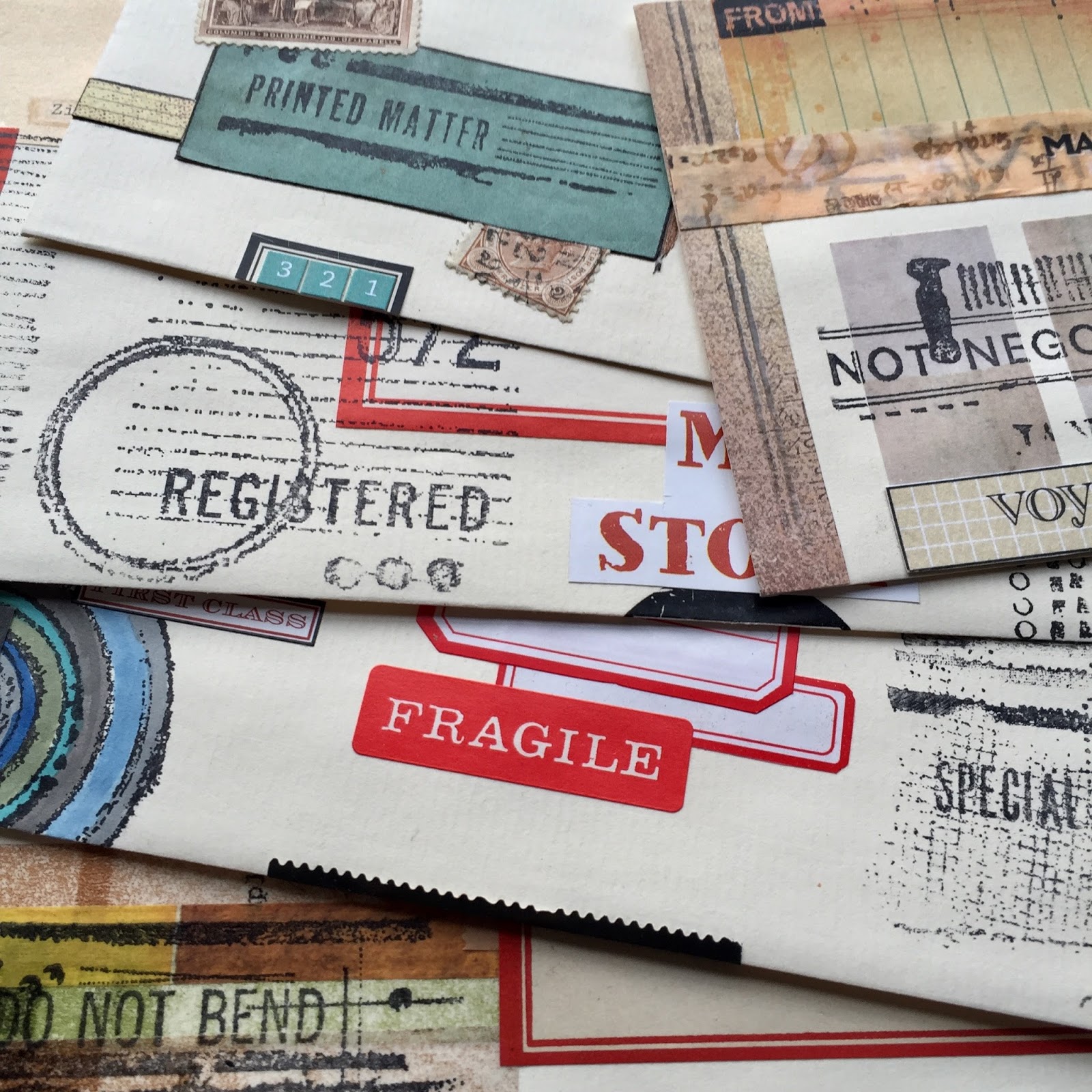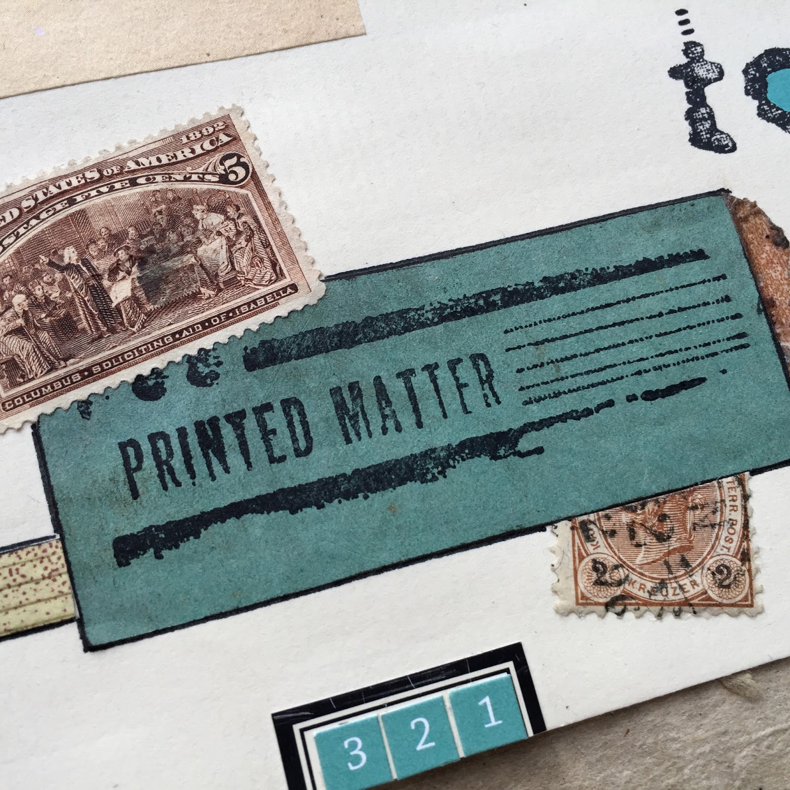 Thrilled to have just released 2 new stamp sets with Impression Obsession. One of the sets is called Post Office. I designed this set of 5 mail art stamps after completing a year-long art collaboration with 3 other artists in 2017. In addition to our art, we decorated and embellished our envelopes as well. Finding a need for some grungy, mixed-media-style postal stamps, I designed this set. Post Office One of the exiting things about designing your own products is the chance to create artwork using them when they first arrive from production. And what better thing to create with these stamps then some mail art. All IO stamps are deeply-etched, cling-backed red rubber. Both of my new sets will be available soon at many online outlets and art/craft shops but can be ordered now the Impression Obsession website, or directly from my online shop.