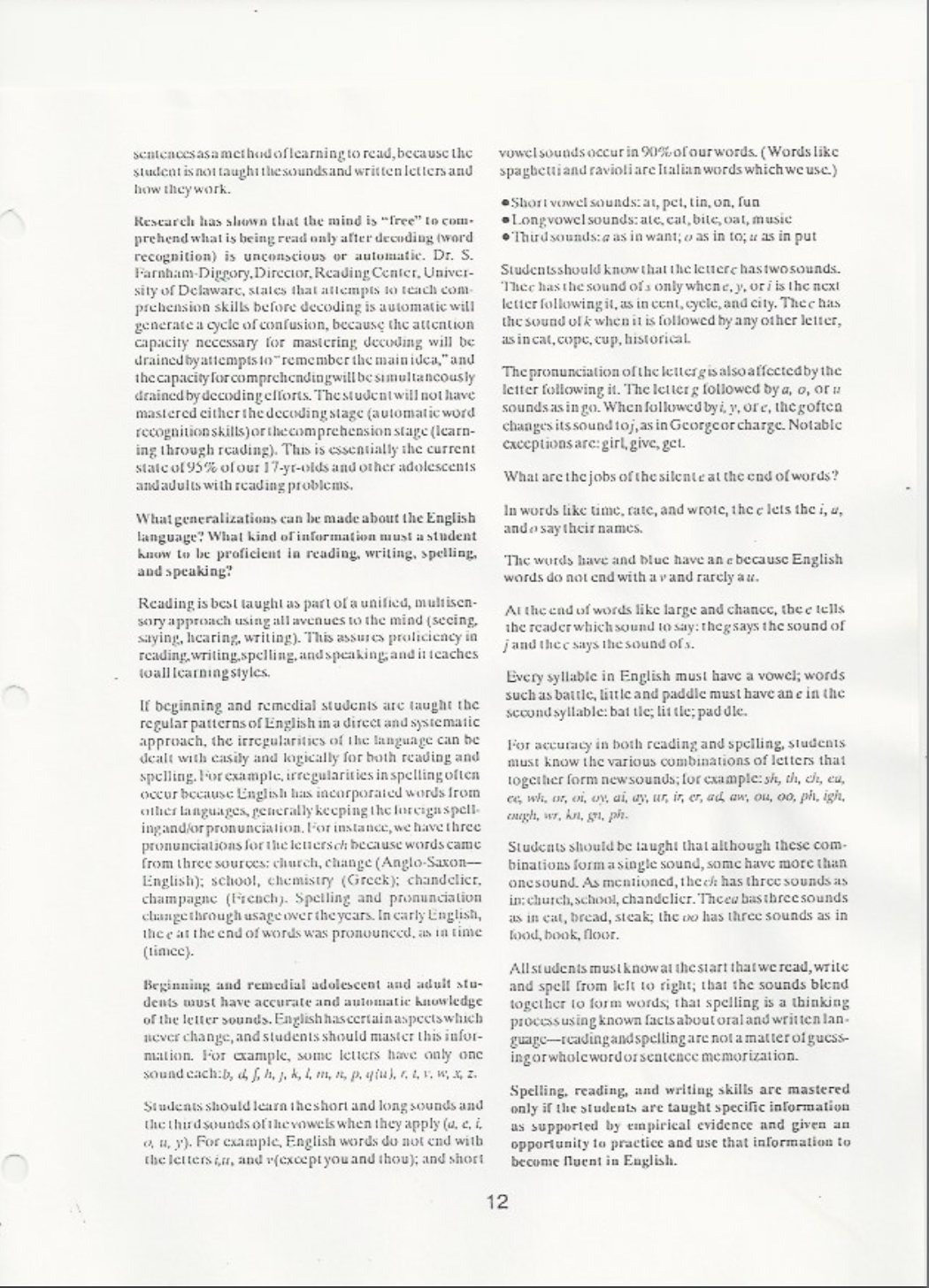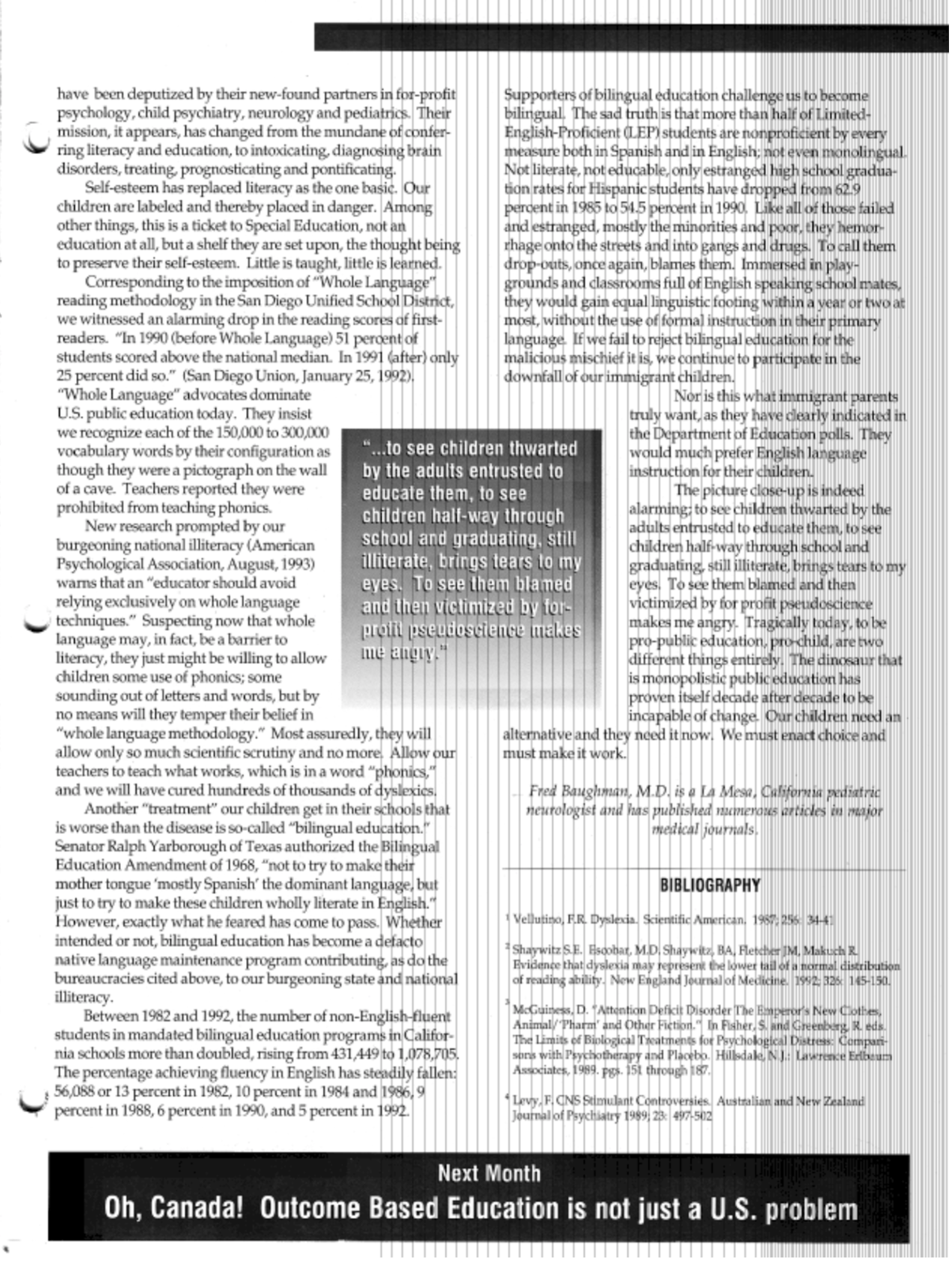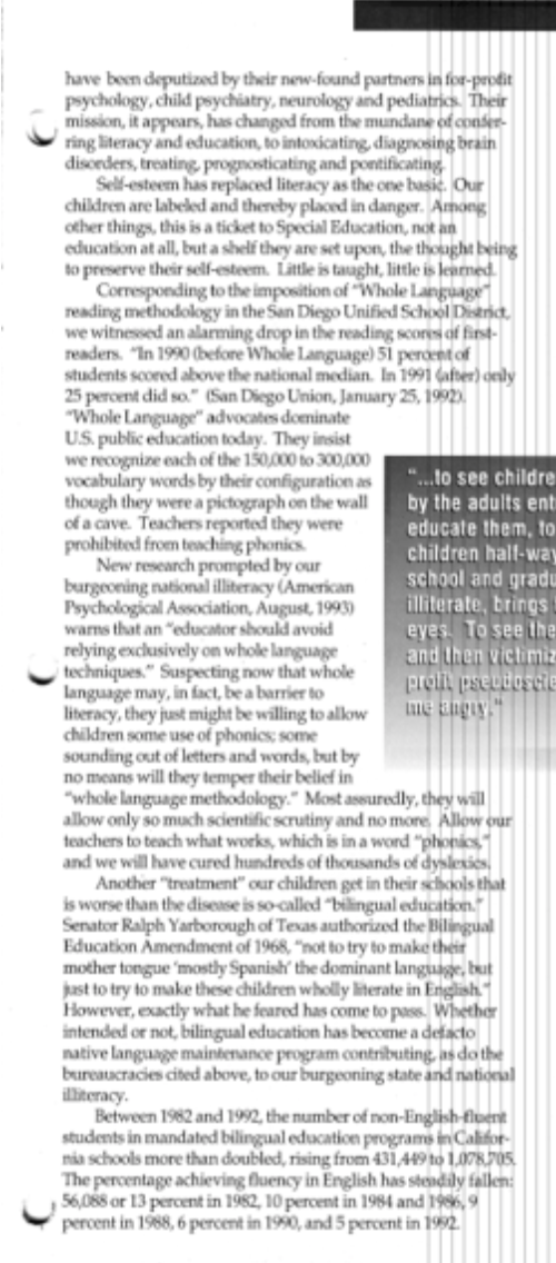 "New research prompted by our burgeoning national illiteracy (American Psychological Association, August, 1993) warns that an "educator should avoid relying exclusively on whole language techniques." Suspecting now that the whole language may, in fact be a barrier to literacy, they just might be willing to allow children some use of phonics some sounding out of letters and words, but by no mens will they temper their belief in "whole language methodology."