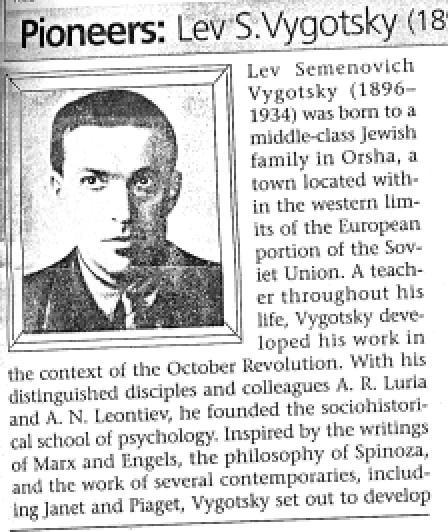"Pioneer of the Whole Language Movement. He developed his work in the context of the October Revolution. With his distinguished disciples and colleagues A. R. Luria and A. N. Leontiev, he founded the sociohistorical school of psychology. Inspired by the writings of Marx and Engels..."