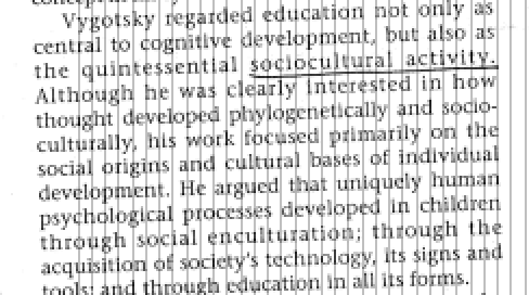 Vygotsky regarded education not only as central to cognitive development, but also as the quintessential sociocultural activity. Although he was clearly interested in how thought developed phylogenetically and socio-culturally, his work focused primarily on the social origins and cultural bases of individual development. He argued that uniquely human psychological process developed in children through social enculturation; through the acquisition of society's technology, its signs and tools and through education in all its forms.