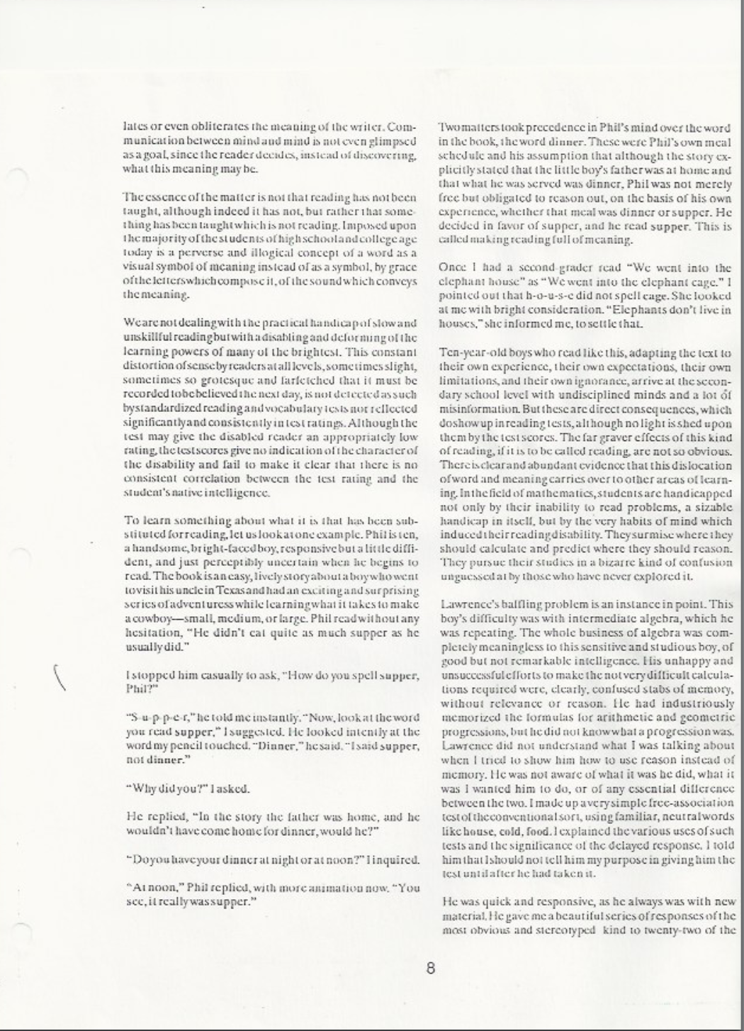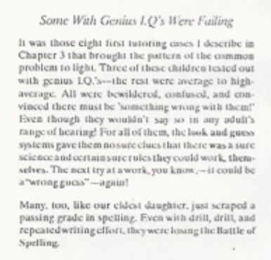 Three of these children tested out with genius I.Q.'s-- the rest were average to high average. All were bewildered, confused, and convinced there must be "something wrong with them!" Even though they wouldn't say so in any adult's range of hearing! For all of them, the look and guess systems (Look Say/Whole Word/ Whole Language/Eclectic/We Do Teach Phonics Pretenders) gave them no sure clues that thee was a sure science and certain sure rules they could work, themselves. The next try at a word, you know--it could be a "wrong guess" -- again.