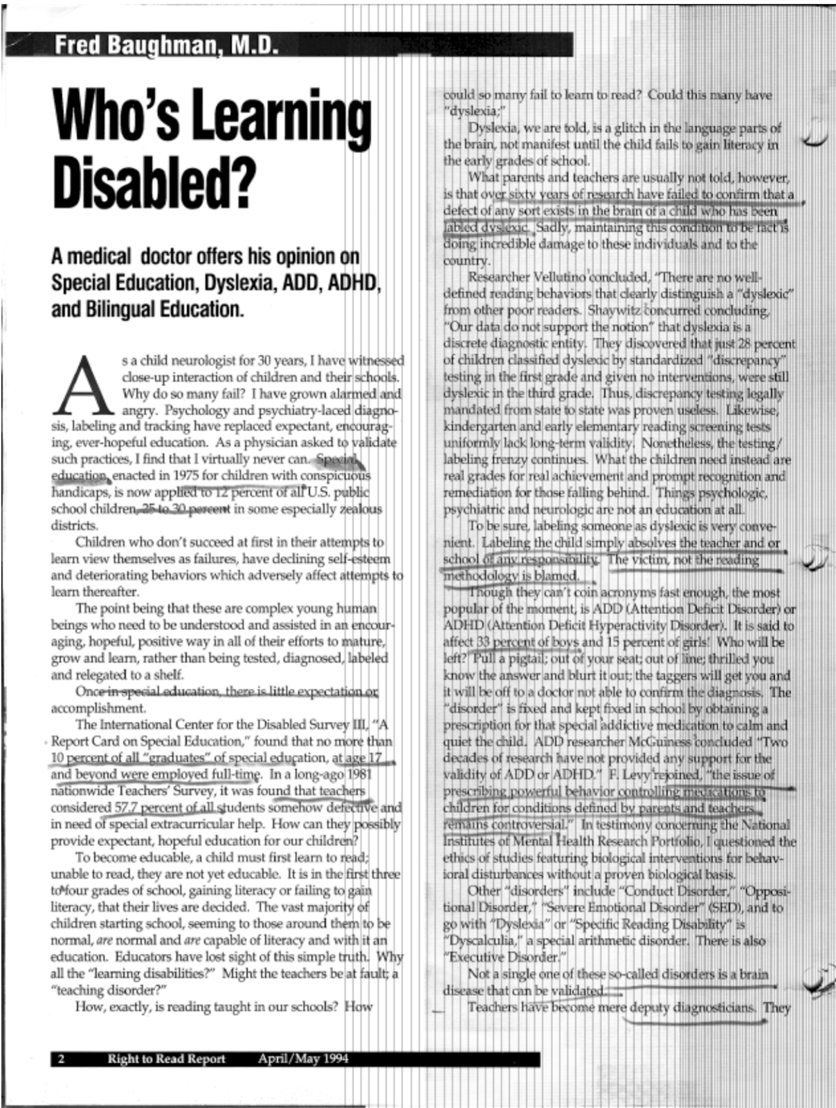 With about fifty percent (47%) of Bay District Schools students unable to read proficiently there is still a very big problem. How many of these children are labeled Learning Disabled? How many are teaching disabled because they are still using a failed method of teaching reading. And why? If John Winston could take a 98%minority school that served 3 housing projects in Natchitoches, Louisiana (Parks Elementary) and bring the usual 40 learning disabled to one or two and end disciplinary problems merely by changing the reading method to the Spalding Writing Road to Reading (an effective Phonics program) why would Bay District Schools hesitate? Too much invested in the old method? (Dothan's excuse in 1992).