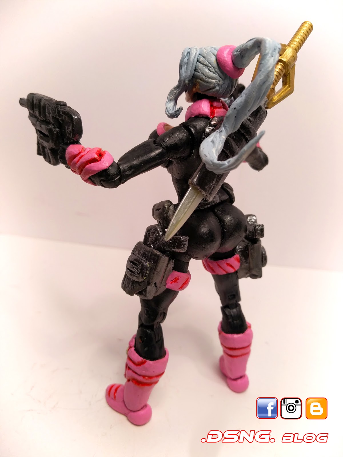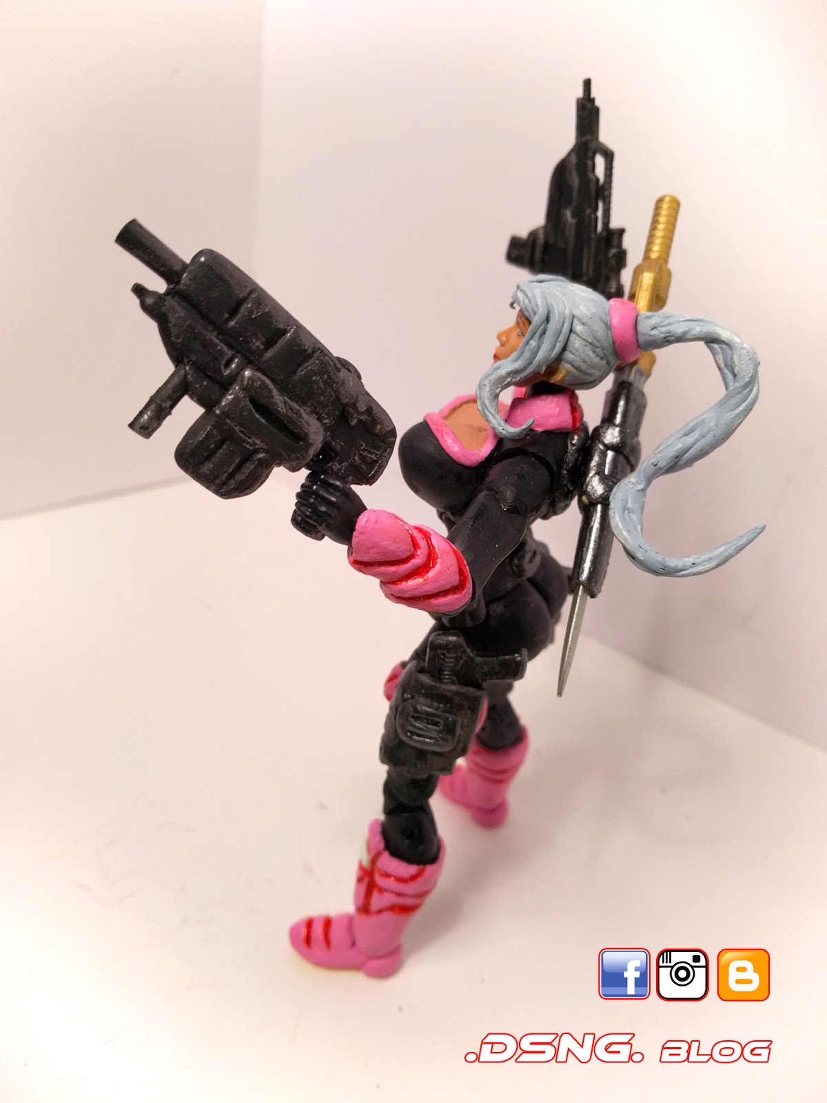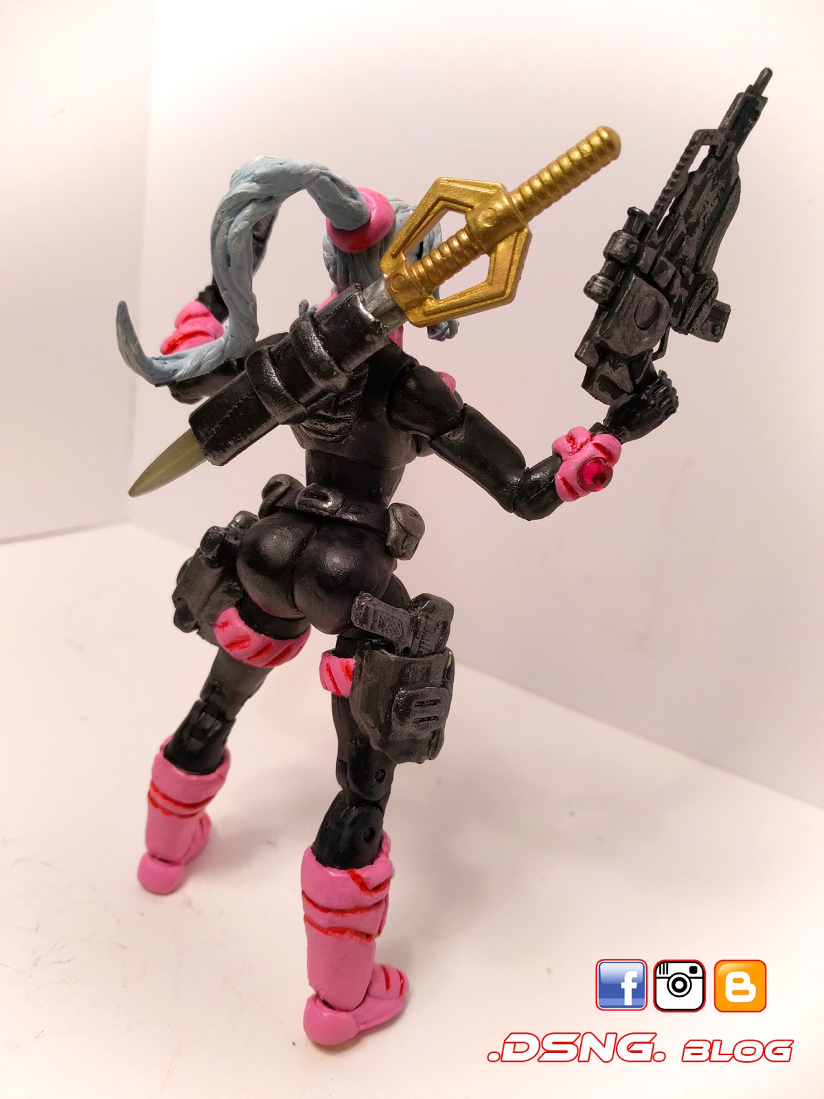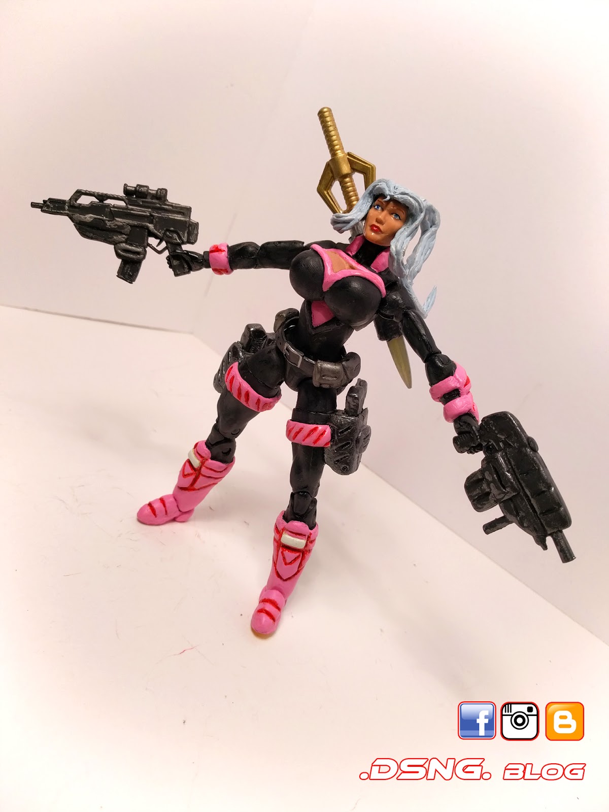 Tamiya paints were used to hand-paint her. And she has four guns and one sword, held to her back via a magnet. Her ponytail is held by a magnet as well. The original DSNG blog article on Elena is over