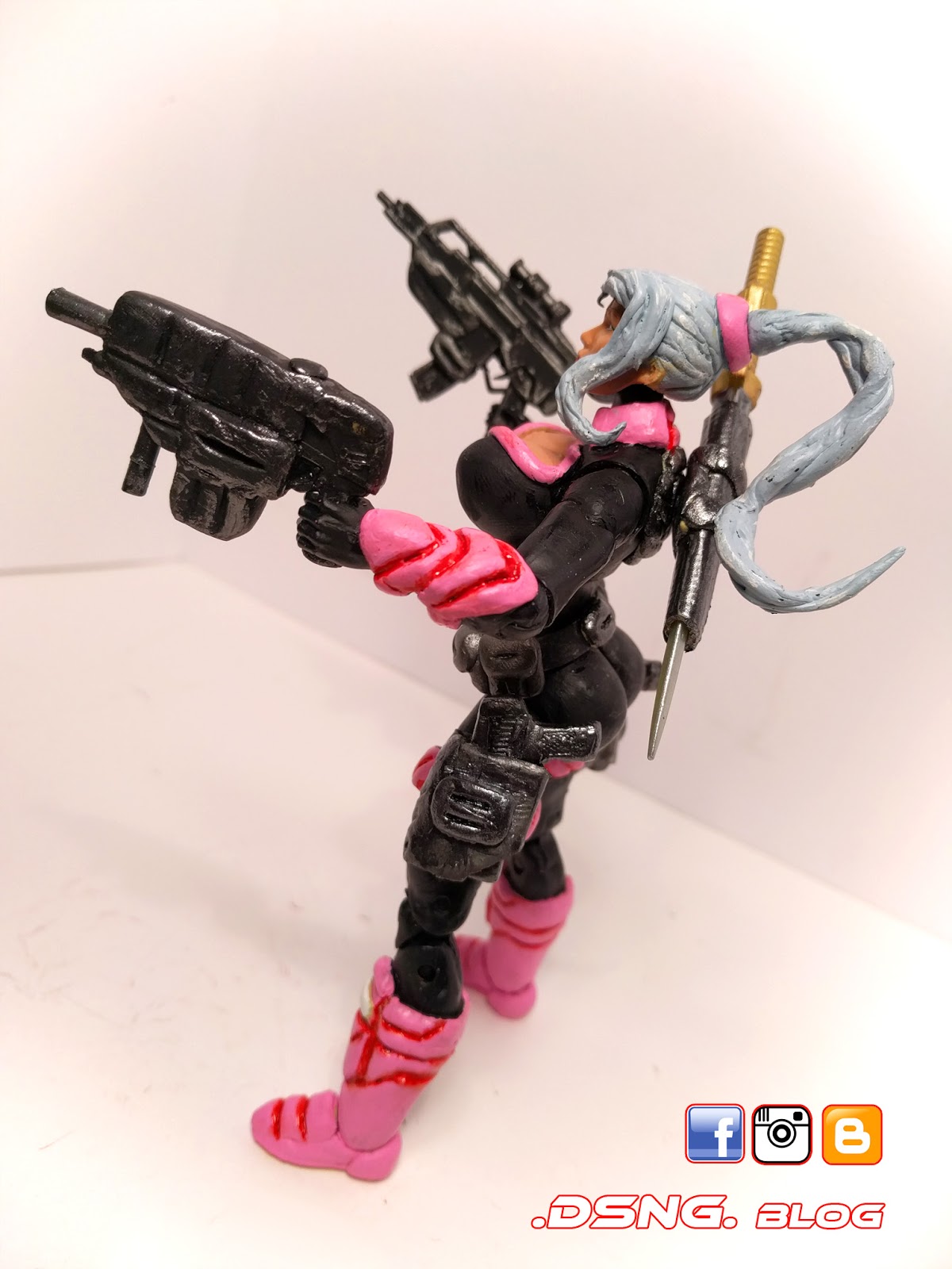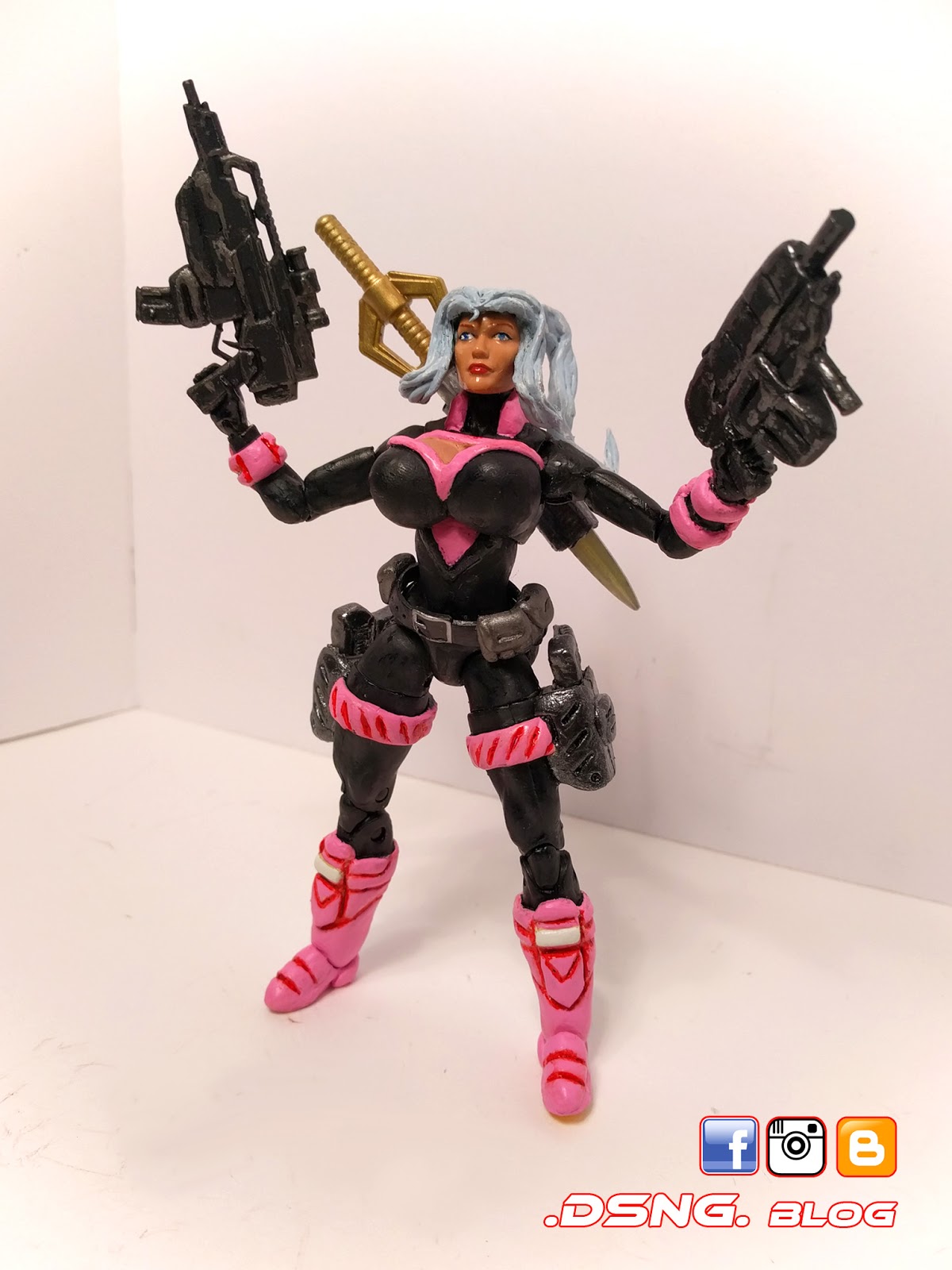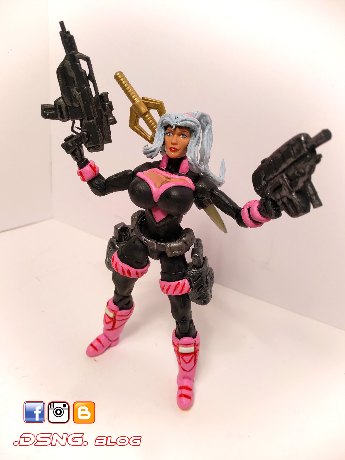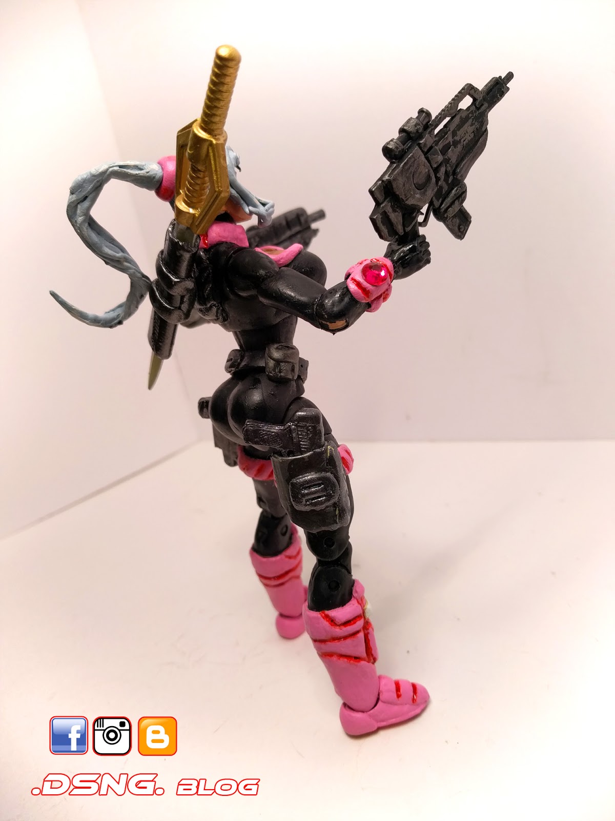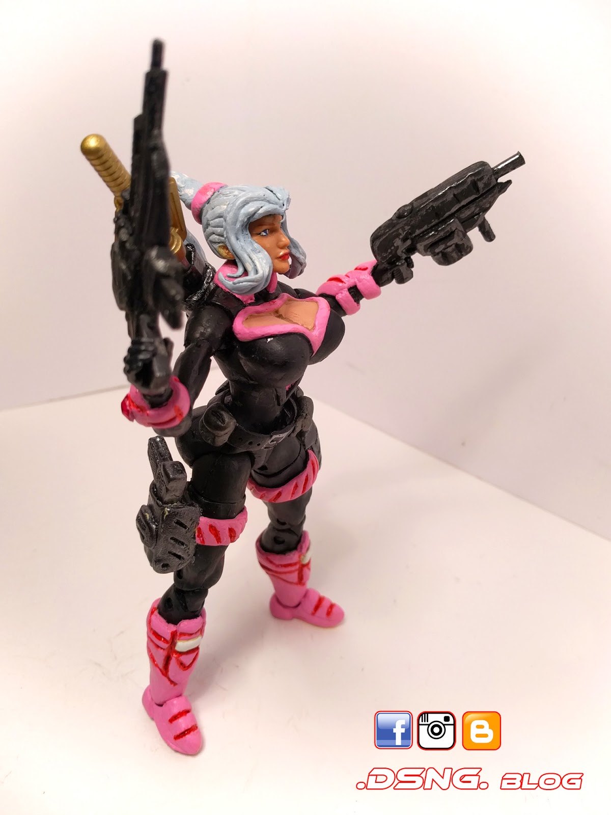 Tamiya paints were used to hand-paint her. And she has four guns and one sword, held to her back via a magnet. Her ponytail is held by a magnet as well. The original DSNG blog article on Elena is over
