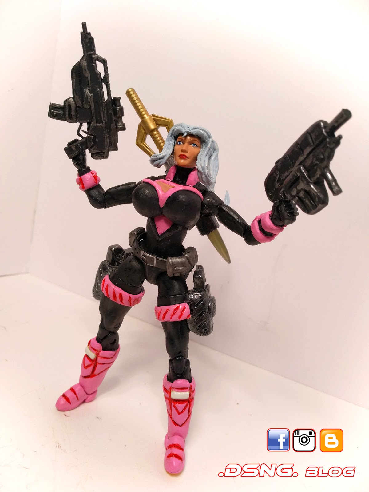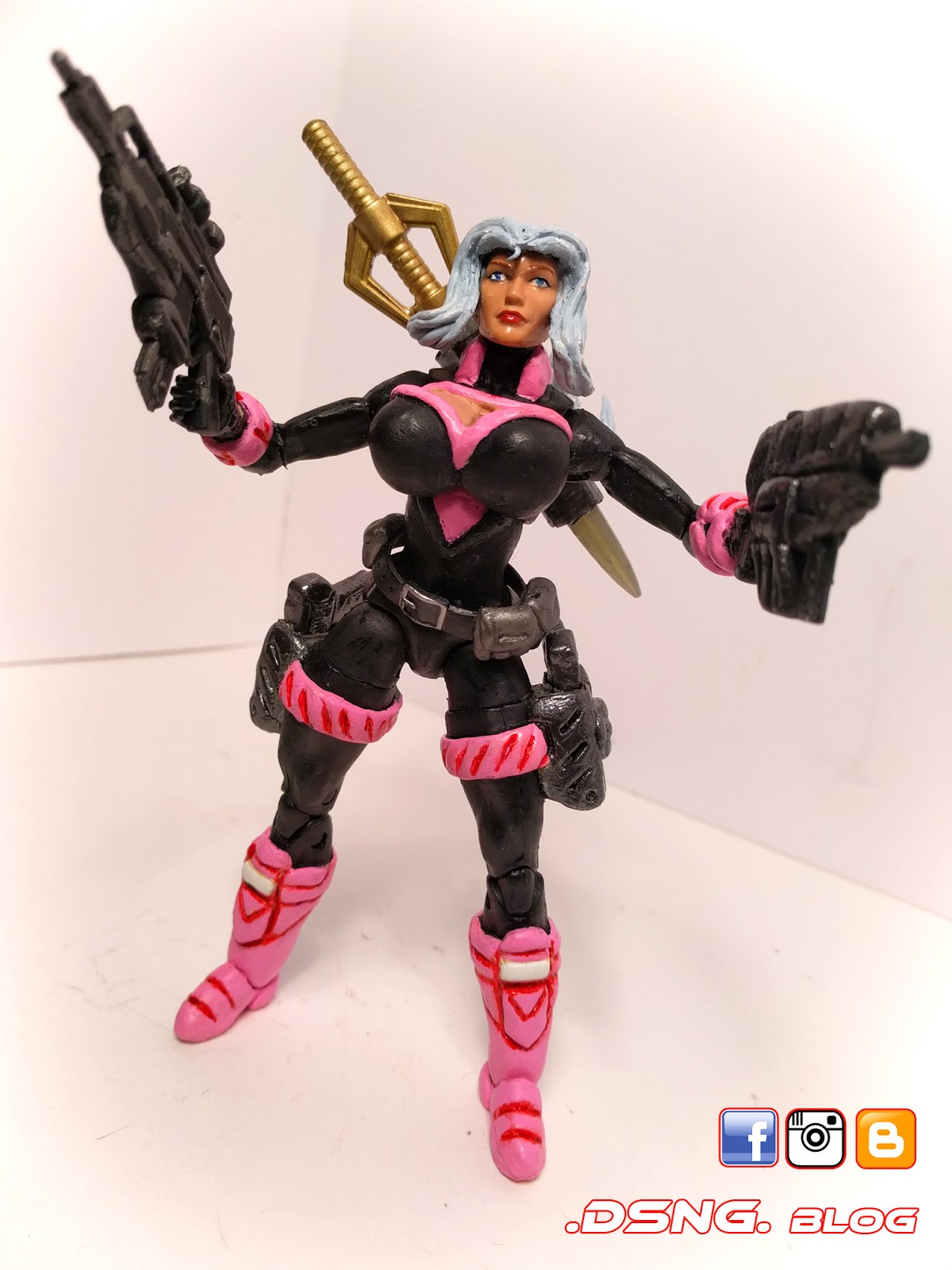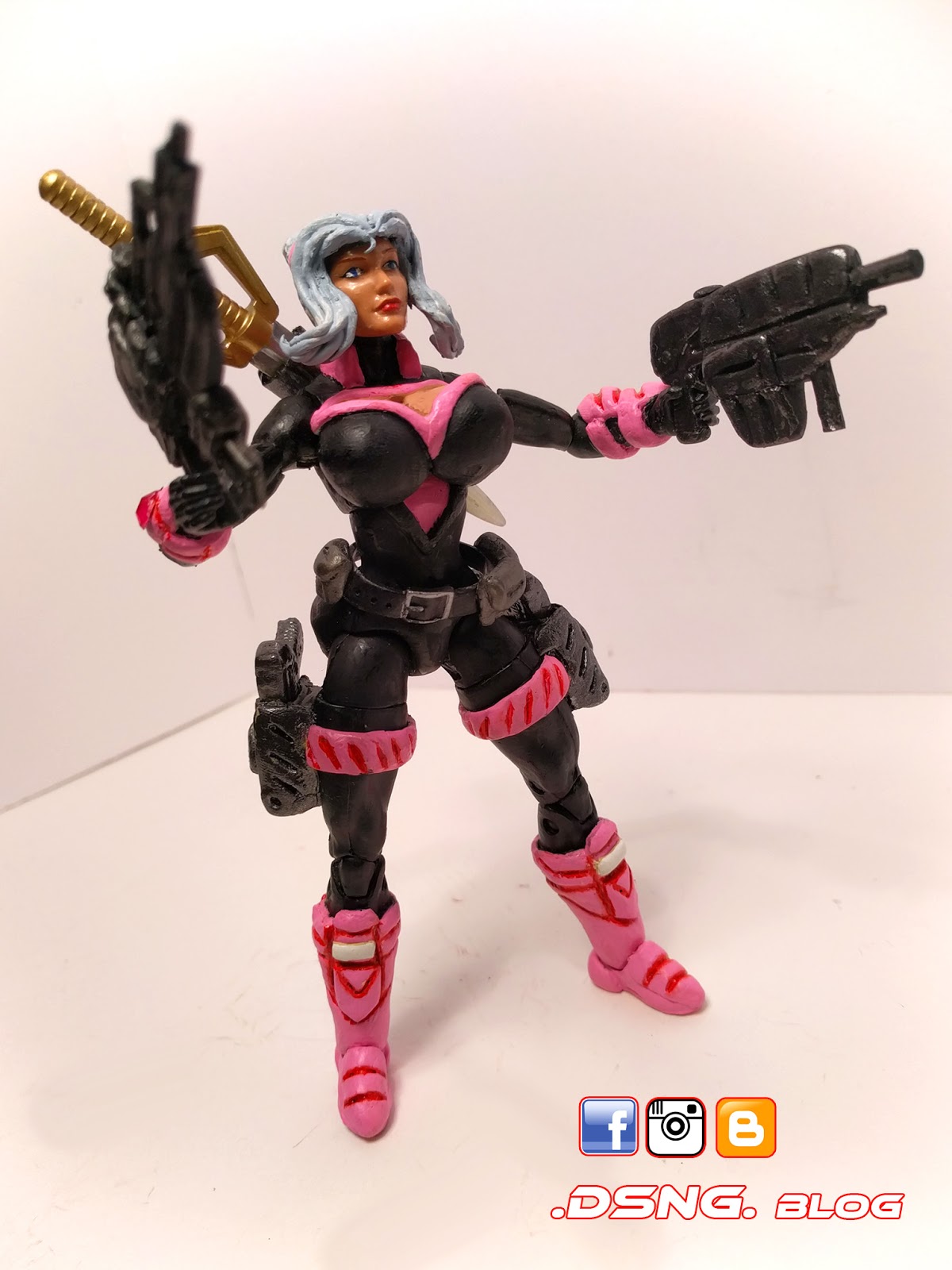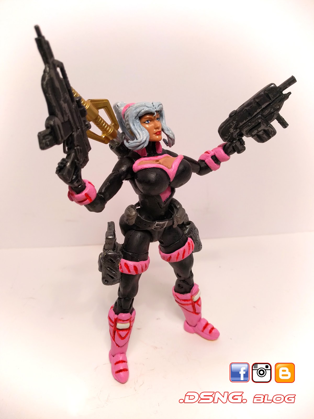 Tamiya paints were used to hand-paint her. And she has four guns and one sword, held to her back via a magnet. Her ponytail is held by a magnet as well. The original DSNG blog article on Elena is over