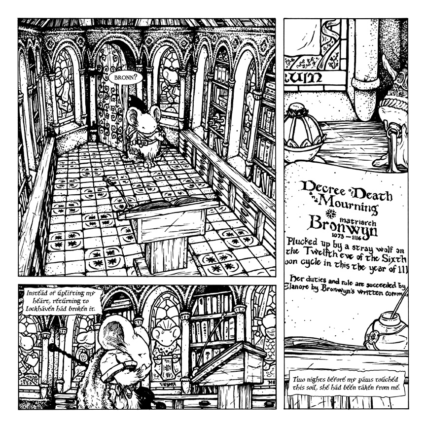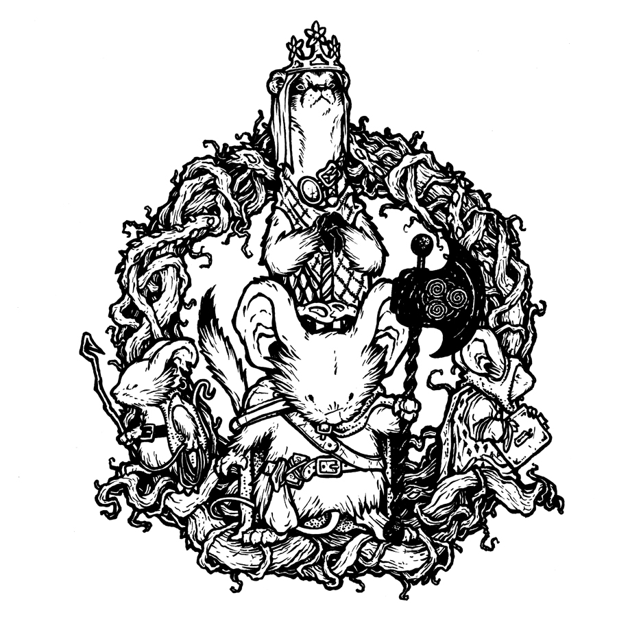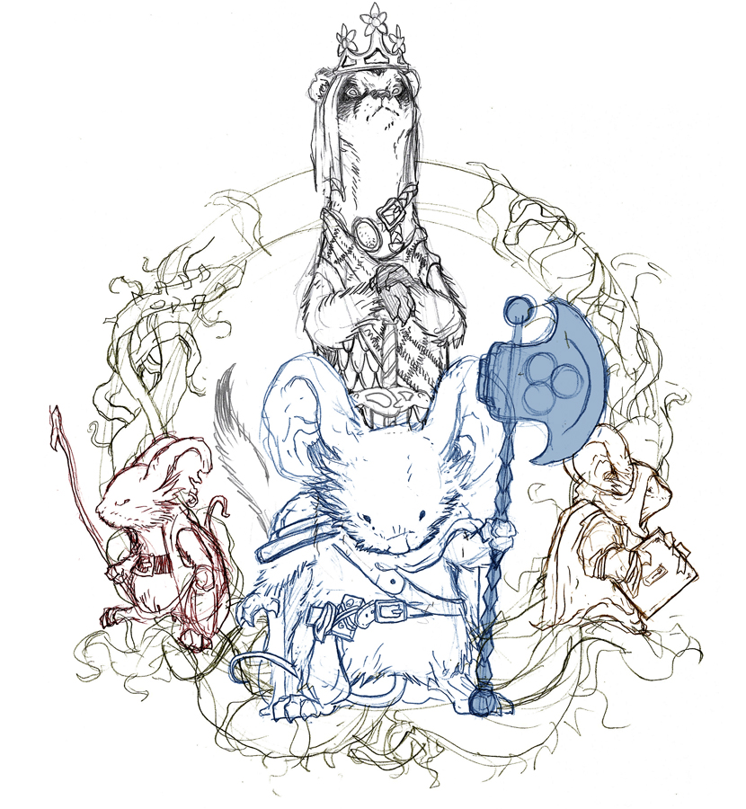 For the cover art (which is debossed into the cloth cover) I sketched up Celanawe flanked by Conrad & Em encircled in a briar wreath with King Luthebon looming over them. I drew the characters all separately on copy paper and then scanned them into Photoshop. Each character (and the wreath) were on different layers and tinted differently to help me move, resize, and compose the image.