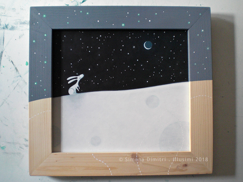 "the white rabbit and the starry sky"mixed media on panel (and its frame)31x29 cm with frame