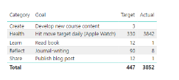 In other words, in row 1 of the Actual table, the Goal is Journal-writing. Power BI finds the corresponding row in the Target column, and returns the [Daily Target] value, 1.