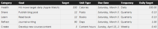 First, the actual data represents the accumulation of data by day from the beginning of the year, whereas the target data represents the final tally at the end of a defined period. Each goal has a different frequency: daily, quarterly, and weekly. Currently, the comparison between actual and target data makes it appear that I’m falling way short of my goals. However, even if I were making solid progress on my goals on a daily basis, the comparison of the two values will never meet until the end of the defined period for any given goal. I need a way to prorate the target data so that I can more reasonably measure my progress.