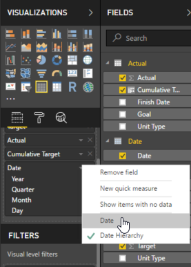 I want the bottom table to show only the Cumulative Target and Actual values without dates. This time, I click the X next to Date and Target in the Values well to remove the fields. My report now looks like this: