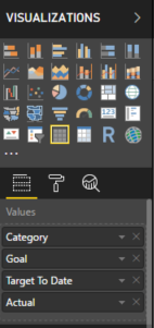 This tells Power BI to use the highest Cumulative Target value, which will also be the last, for the current filter context. Filter context is a subject I’ll tackle another day, but suffice it to say for now that all the filters in the panel to the right as well as what you see in the visualization for a given row affect the measure calculation. It’s a little more complicated than that, but… another day.