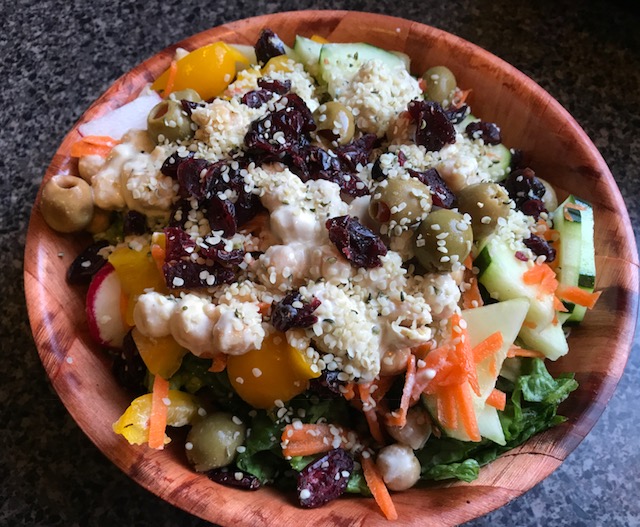 Dinner was a big ole Salad with Chickpeas and Tahini Dressing. Can y'all tell I love tahini??? This also has green olives, hemp hearts, dried cranberries, cucumber, bell pepper, radish, carrot, and romaine.