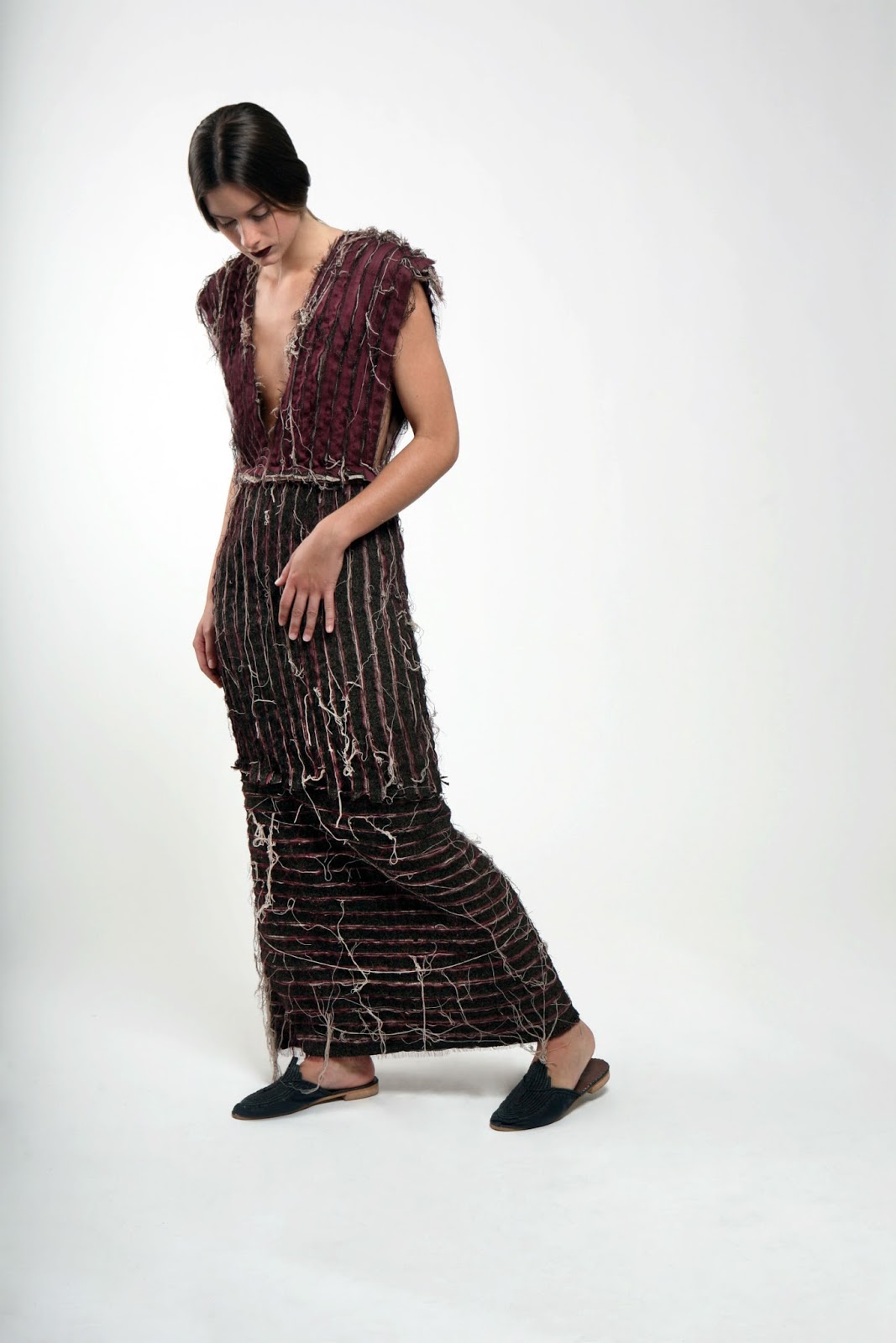 “Me influye mucho el estado de ánimo y el período por el que estoy pasando. Hay épocas que me vuelvo mucho más sensible y perceptiva y es ahí cuando tengo que aprovechar de sacar todas las ideas que se me crucen por la cabeza. De ahí en adelante, lo que más hago es dibujar y experimentar con las telas hasta llegar a un resultado interesante. Me gusta explorar sus cualidades, llevándolas al extremo. Deshilo, quemo, someto a calor, etc. De este modo logro entregar valor a telas que inicialmente se ven de una calidad inferior”.