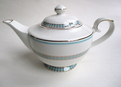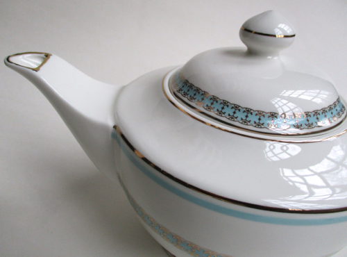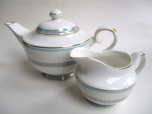 On Saturday, I visited one of the big T.J. Maxx/HomeGoods stores, the one in Smyrna, and I was delighted at all the new teawares I found in colorful spring pastels. There are some really pretty new teacups, and I almost came home with one of them, but instead, I bought a new Gracie's teapot ($12.99) and creamer ($4.99). I had $10 on a gift certificate left to use, so my "set" was really more like $7.98. Not bad!