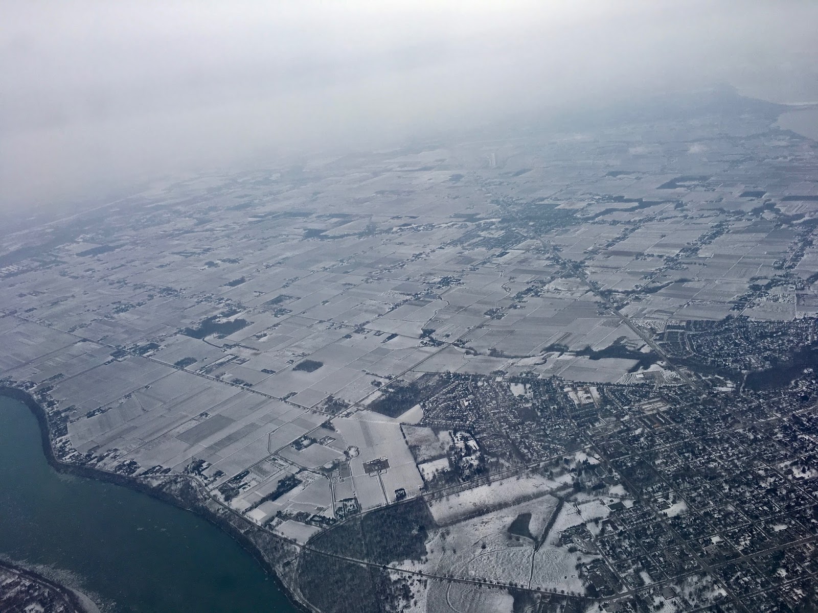 The trip to the airport was stressful - nearly an hour's wait for a train at Penn Station, in a hall where there is not a single bench or chair, I guess because the many, many New York homeless would camp there - so we all sat on the floor. Finally the train was announced and set off, and then stopped because a bridge ahead was stuck open. "Delay," they said, "not sure how long." Just what a person heading for the airport likes to hear, with no more flights that day. I panicked, of course. Infrastructure in the U.S. is appalling - roads, trains, everything - but of course their fine president is going to fix that. Anyway, we got there and took off. Canada looked even colder than New York.