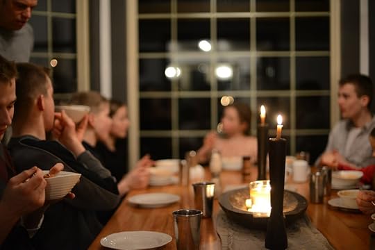 The house and the kids hush in the evening thickening and falling and the candles flicker boldly on.