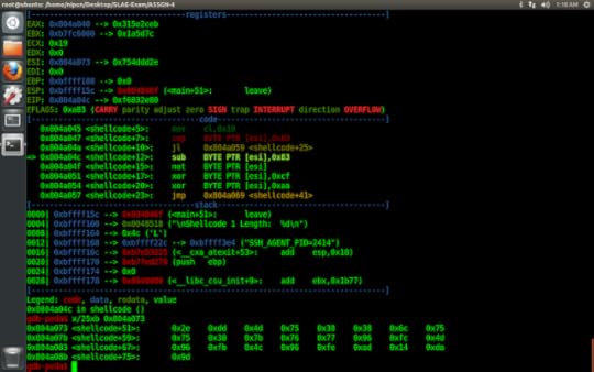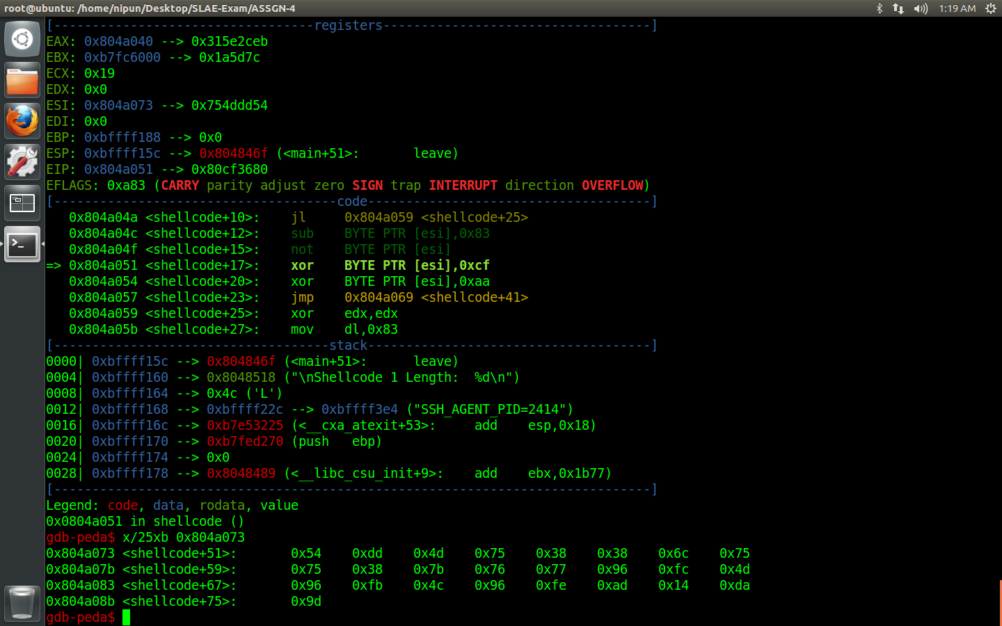 Works!! Great. We can see that the length of the shellcode is 76 bytes. Let's run this program in GDB and analyze the step by step decoding process as follows: