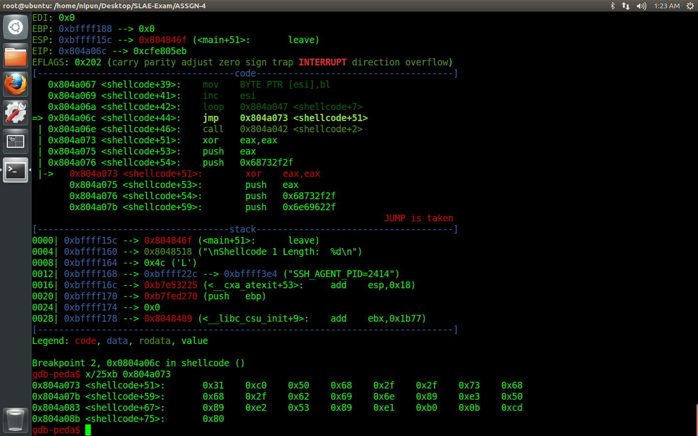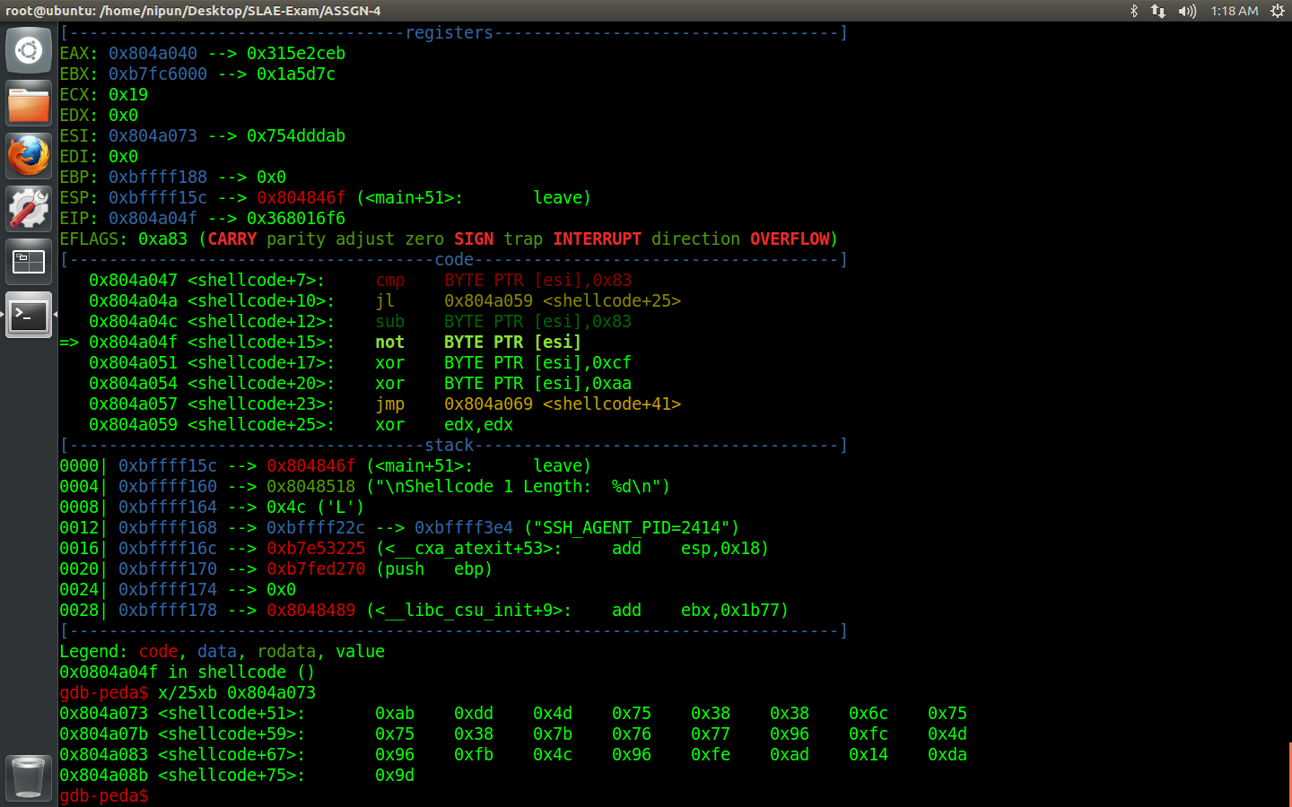 Works!! Great. We can see that the length of the shellcode is 76 bytes. Let's run this program in GDB and analyze the step by step decoding process as follows: