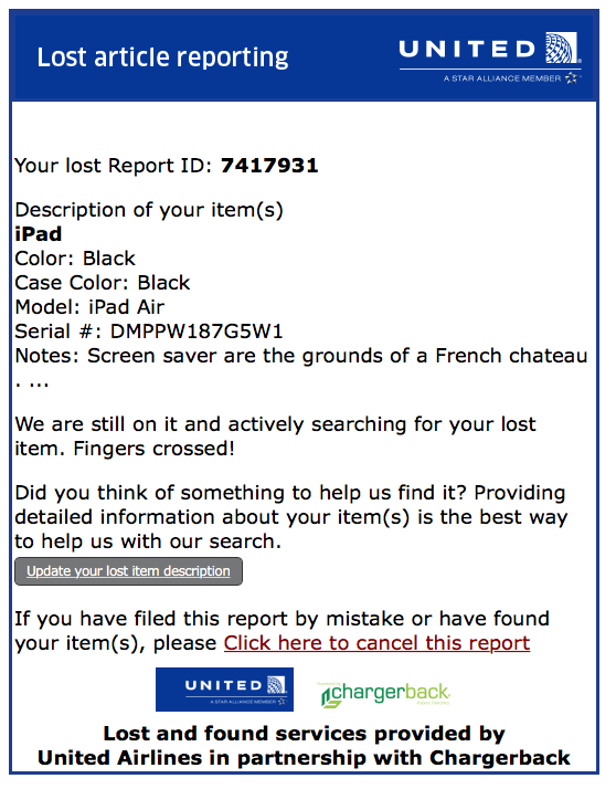 Get that: Fingers crossed! It’s such a small touch, but what an easy way to counter the image of corporate indifference. In one email early on, United informed me that it would keep up the search for my iPad for a month, giving me complete clarity and transparency for what I could expect. Then! Almost a month to the day after filing my report, United emailed me to cheerfully announce it had found my iPad. An agent at its Dallas office then emailed me to say she had my iPad in hand and would be sending it out as soon as I told her how I wanted it shipped.