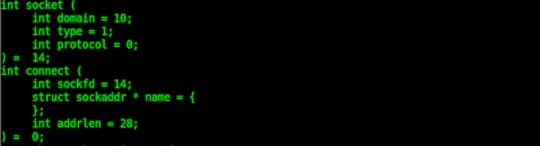 Hence, we have EAX: 0x66 , EBX: 0x1, ECX:{10,1,0} and we issue the interrupt. The arrangement will issue a socketcall of type SYS_SOCKET with the domain as 10 (IPV6) and type as SOCK_STREAM.