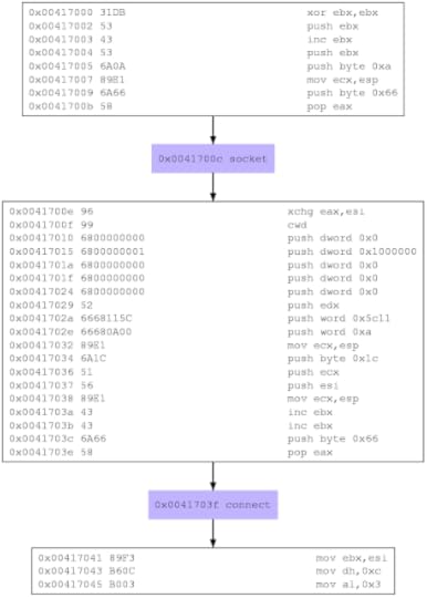We can see that we have two systems calls in this shellcode. The first is the socket setup and the next one is connect. We can use libemu with the -G option to create a dot based graphics file which simplifies things for us. The dot graph file can then be converted into a PNG image using the dot utility in linux. Let us see the obtained PNG as follows: Let's analyze the above flow diagram. In the very first block, We start by clearing out EBX register which means that now EBX contains 0. We push this value onto the stack. Next, we increment EBX register making its value as 1 and push it again to the stack. Next, we push 10 onto the stack. Hence the stack (from the top) becomes a structure like {10,1,0}. In the next step, we simply point this structure to ECX. Hence ECX now contains the address of the structure we created above. The structure consists of very similar values as in the first screenshot. This means 0 points to the protocol(0), 1 to the type and 10 as the domain, i.e., AF_INET6(IPv6). Type 1 denotes SOCK_STREAM. Next, we simply perform a push-pop to EAX with the syscall number 0x66 that denotes socketcall.