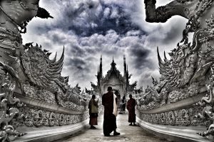 Monks paying their respect at the White Temple in Chiang Rai, Thailand