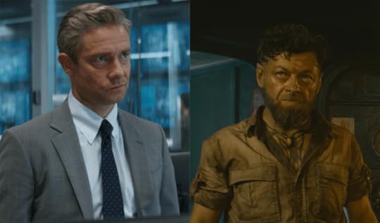 Martin Freeman and Andy Serkis looking thrilled about their roles.Then, it turns out that our hero’s Dad did something pretty inexplicably unkind in his past — giving Michael B. Jordan (the other villain) a pretty justifiable reason for being a villain — which undercuts the heroism of our main characters, and undercuts you wanting him to be defeated, even though his character is really just a big dumb thug. The movie attempts to be socially-just and political in parts, but didn’t even get a theme going in that area — the overall “moral” of the film was confused at best, throwing in a few social-justice buzzwords and ultimately not achieving a point. In other words, the plot was just as murky and muddy as the visuals of the film. Very disappointing. I have no idea why this movie is getting such rave reviews, other than people are afraid to say that they don’t like it for fear of being called racists.