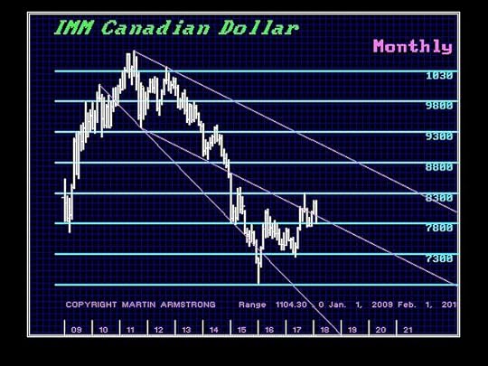 Direct investment into Canada declined by a stunning 26% dropping to merely $33.8 billion during 2017, according to Statistics Canada. Capital inflows have declined for the second year with the major high in 2015 in accordance with our Economic Confidence Model. The investment that did take place was from reinvested earnings of existing operations. Net foreign purchases of Canadian businesses turned negative for the first time in a decade. This means that foreign companies sold more Canadian businesses than they bought. The political shift in Canada to the left is also being seen as a political risk for the years ahead. A monthly closing BELOW 7305 on the futures will signal the collapse of the C$ is underway once again.