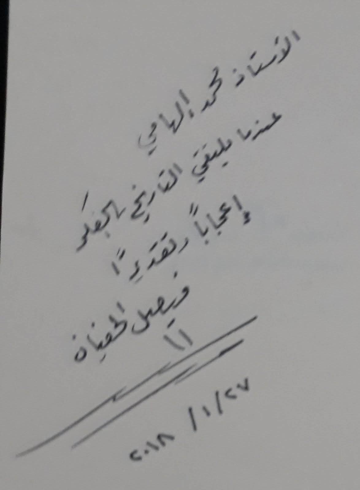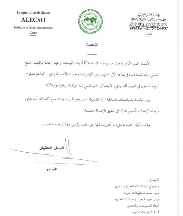 تفضل على أستاذنا الرقيق الخلوق الدكتور فيصل الحفيان، مدير معهد المخطوطات العربية بالجامعة العربية، بهذه التزكية التي تشرفت بها، وكنت أحتاجها في مسار دراسي أنا بصدده.