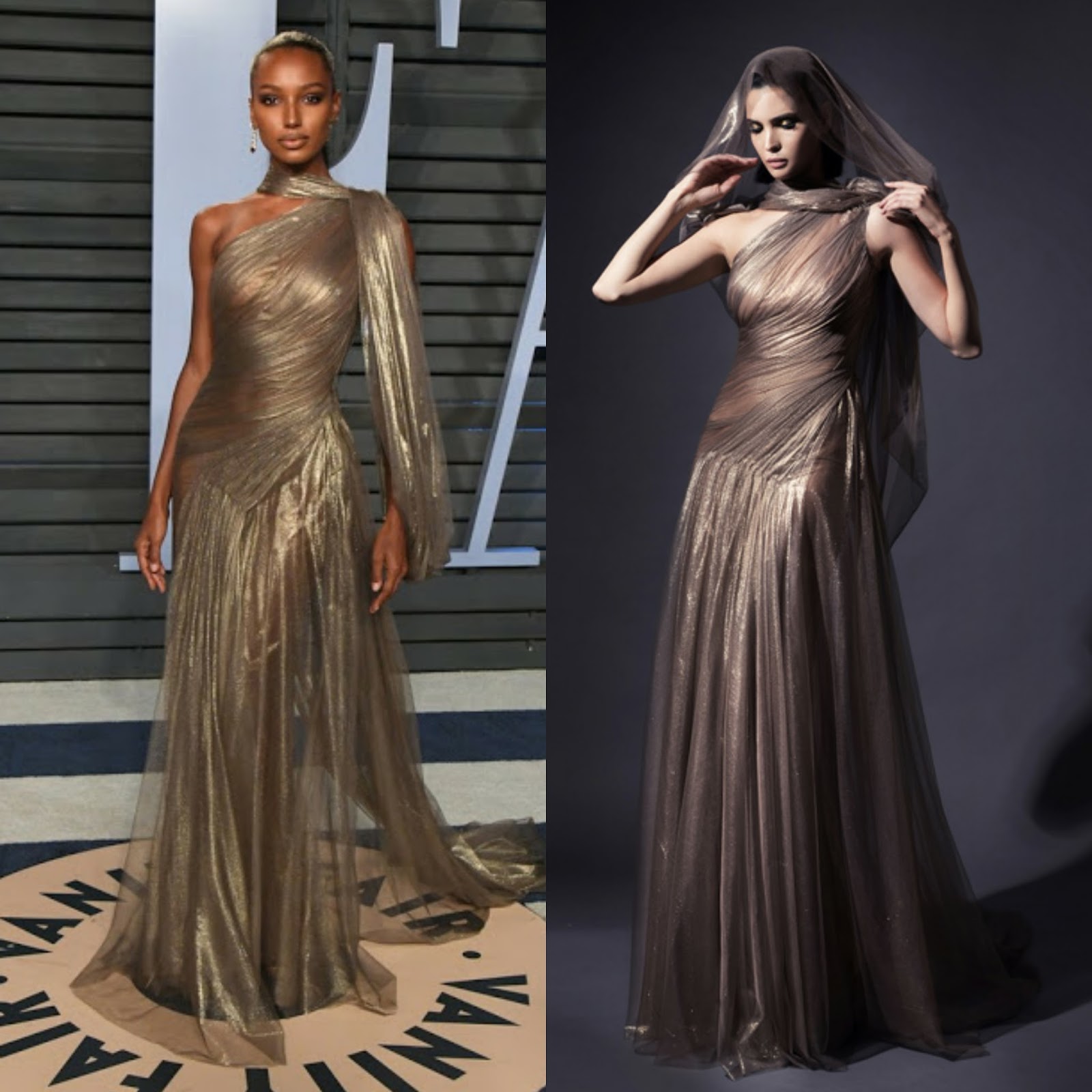 Jasmine Tookes in Jean-Louis Sabaji Couture Spring 2018--Victoria's secret Angel/Supermodel Jasmine Tookes wore this golden lame gown from Beirut Lebanon-based Jean-Louis Sabaji Couture Spring 2018 collection...and naturally she looked FLAWLESS. I mean, seriously, just look at her...that skin...that gold fabric effortlessly draped on her...Wow!