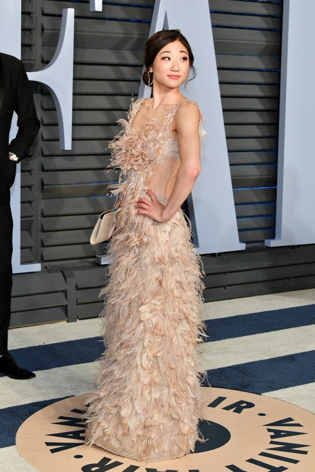 Mirai Nagasu and Adam Rippon--While Adam--wearing Moschino--did not change for the Vanity Fair Oscar Party (he wore this to the Oscars), Mirai did do a gown change from a blue colored Tadashi see-through gown to this blush/golden feathered concoction. Whether it was intentional or not, I kinda like the slight (or not so slight) hint of a "Swan Lake-like figure skating costume.