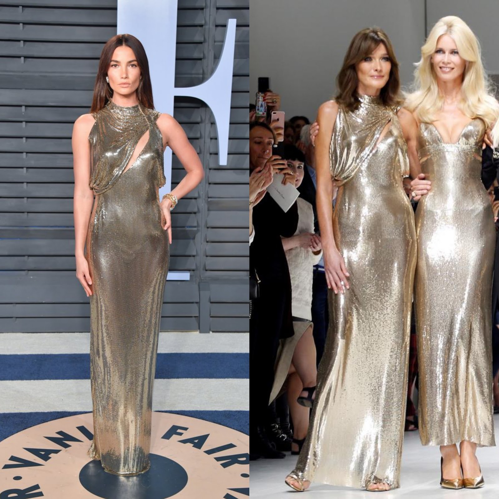 Lily Aldridge in Gianni Versace Spring 2018--Lily wore this gold chainmail gown from Gianni Versace's 20th Anniversary collection for Spring 2018, shown last September. This particular dress is a recreation of one of Gianni Versace's most iconic gowns from Versace's Autumn/Winter 1994 Atelier Versace collection (lower photo). The style Lily wore was modeled at the Spring 2018 show by the one-and-only former First lady of France, Carla Bruni (top photo, left).