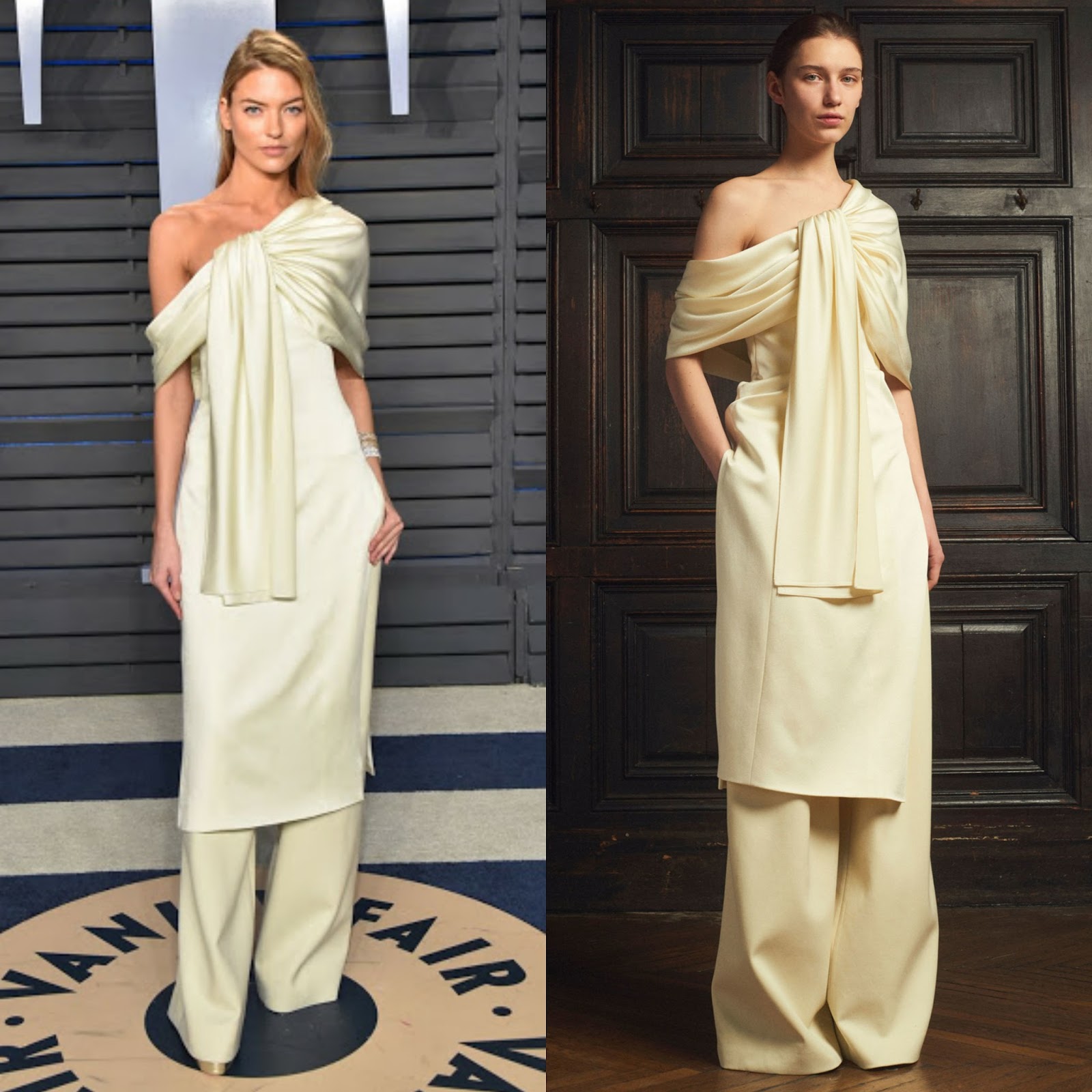 Martha Hunt in Marina Moscone Fall 2018--Victoria's Secret model Martha Hunt looked quite elegant in this tunic-and-pants ensemble from NY-based Maria Moscone and her Fall 2018 collection. I loved how effortless this look was and still perfectly suited for a red carpet party! I especially admired the neckline drape that mimicked a sporty tied sweater, albeit much more Haute!