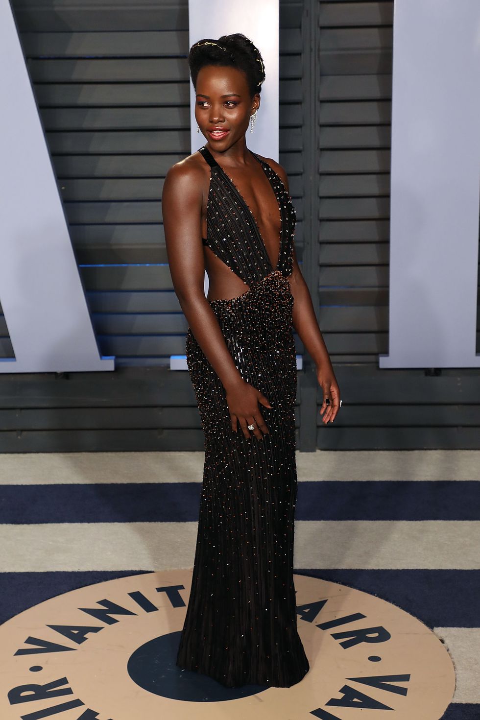 Lupita Nyong'o in Custom Armani Prive--Lupita changed from the gold-and-black chainmail-and-sequin Custom Atelier Versace gown that she wore at the Oscars to this black sequined number from Armani Prive custom-made for her. The black color with the sparkly Swarovski crystals made the gown look like a star-filled night sky on Lupita. The fit was perfection as well.